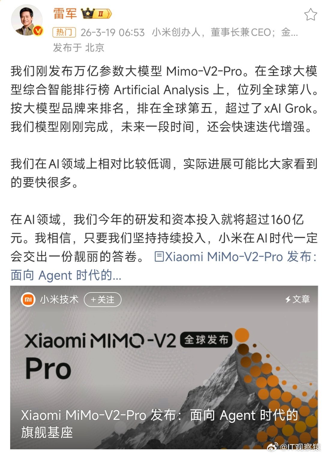 小米大模型小米推出三款全新自研大模型—— Xiaomi MiMo-V2-Pro、Xiaomi MiMo-V2-Omni 与 Xiaomi MiMo-V2-TTS,全面布局 Agent 时代的技术底座。以后小米手机要用自家大模型了?