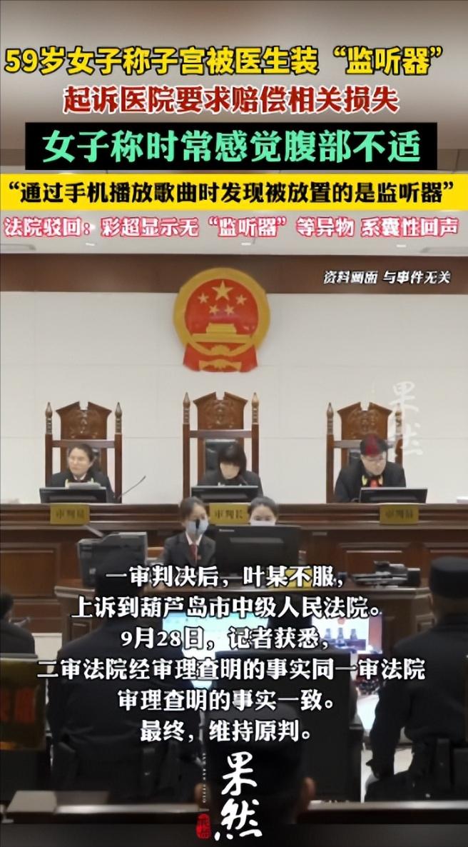 辽宁一59岁女子去医院取避孕环,几年后,她用手机播放歌曲时,发现医生悄悄在她子宫里安了监听器,导致她肚子很难受,女子一气之下,把医院告上法庭... 2016年,49岁的叶某在当地一家医院做了宫内节育器取出手术,她本身有子宫次全切的既往病史,术后身体状态本就比常人更敏感。 按照常规医嘱,术后一周需要复查排查异常,可叶某并没有按时复诊,只是觉得术后出现的腹部隐痛是年纪大、恢复慢的正常表现,一直拖着没有进一步就医。 这份拖延让短暂的不适慢慢演变成了长期折磨,腹部胀痛越来越频繁,就连吃饭睡觉都受到影响,日积月累的难受,让叶某心里的疑云越积越重。 真正让这份疑虑彻底跑偏的,是一次在家用手机播放歌曲的日常瞬间。 当时她把歌曲音量调大,腹部突然传来一阵细微的拉扯震动感,这股莫名的触感,让她瞬间把多年的不适和一个离谱的猜测绑定在一起。 她固执地认为,当年取环的时候,医生偷偷在自己子宫里放置了监听器,腹部的所有不适,都是这个隐秘设备在作祟,手机声响的震动更是触发了体内的装置。 抱着这样的执念,叶某一心想找到所谓的“证据”,2025年1月,她特意换了医院做腹部彩超检查,结果显示左附件区有2.7×2.4厘米的囊性回声,伴随少量盆腔积液,全程没有发现任何电子、金属类异物的踪迹。 面对专业的医学结果,叶某并没有释怀,反而坚信这是医疗机构串通掩盖真相,把生理性囊肿硬生生认定为监听器,拒绝接受任何专业解释。 带着这份偏执的认定,叶某在2025年3月正式将涉事医院告上法庭,要求医院无偿取出体内的“监听器”,赔偿经济和精神损失,后续还追加了公开道歉的诉求。 庭审环节的举证交锋,彻底暴露了这场诉讼的站不住脚。 叶某只能拿出彩超报告、零散的就医记录和一段腹部不适的录音,这些材料根本无法佐证监听器的存在,她既说不出所谓监听器的型号、工作原理,也拿不出半点证据证明医生有植入设备的动机和机会。 反观医院一方,完整的手术录像、器械清点记录都能证明,当年的取环手术全程合规,有医护人员全程在场见证,没有任何多余操作和异常器械使用。 一审法院审理后认定,现有医学证据足以证明叶某体内不存在监听器,她将囊性回声误认为异物没有任何事实依据,即便假设存在异物,也无法证明与当年的取环手术有关,依法驳回了叶某的全部诉求。 一审败诉后,叶某并不服气,坚持向葫芦岛市中级人民法院提起上诉。 二审法院核查后发现,案件事实与一审完全一致,叶某始终没能拿出充分证据支撑自己的主张,按照“谁主张谁举证”的司法原则,她必须承担举证不能的后果,最终二审驳回上诉,维持原判,两级法院的判决均在9月28日对外公布。 其实从医学角度来看,叶某长期的腹部不适并非无迹可寻,围绝经期女性本就容易出现生理性囊肿,这类囊肿发病率高达18%,大多无需特殊治疗,定期观察即可。 而她持续多年的躯体不适和偏执认知,更符合躯体形式障碍的特征,这类疾病会让患者真实感受到身体痛苦,却找不到对应的器质性病变,多由长期焦虑、心理压力过大引发,需要的是专业心理干预,而非盲目追责。 身体出现不适时,及时就医、遵从医嘱、相信专业检查结果,才是解决问题的正道,仅凭个人猜测就定性医疗伤害、发起诉讼,不仅会耗费自己大量的时间精力,还会占用司法资源,给正常运营的医疗机构带来不必要的舆论困扰。
