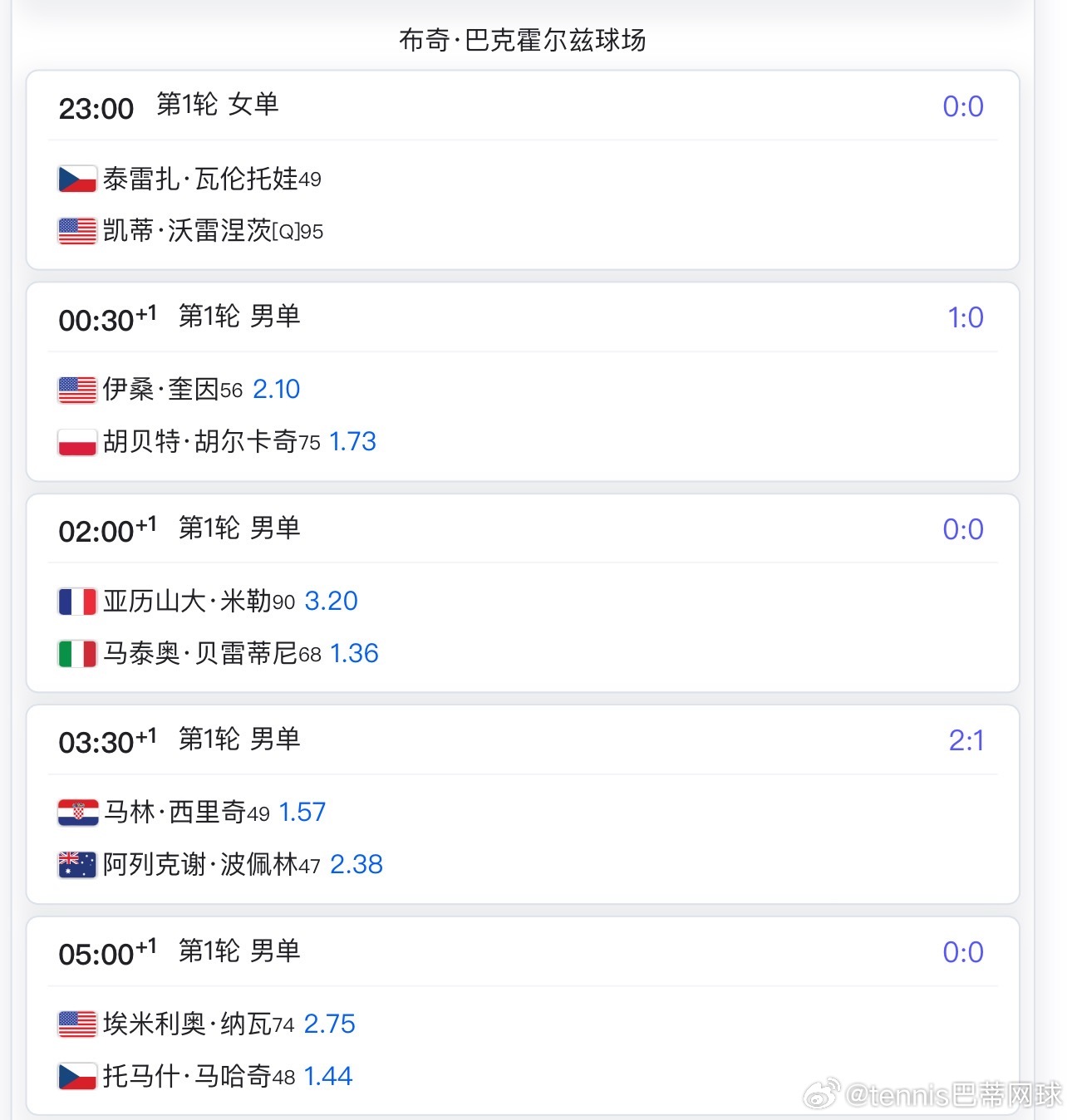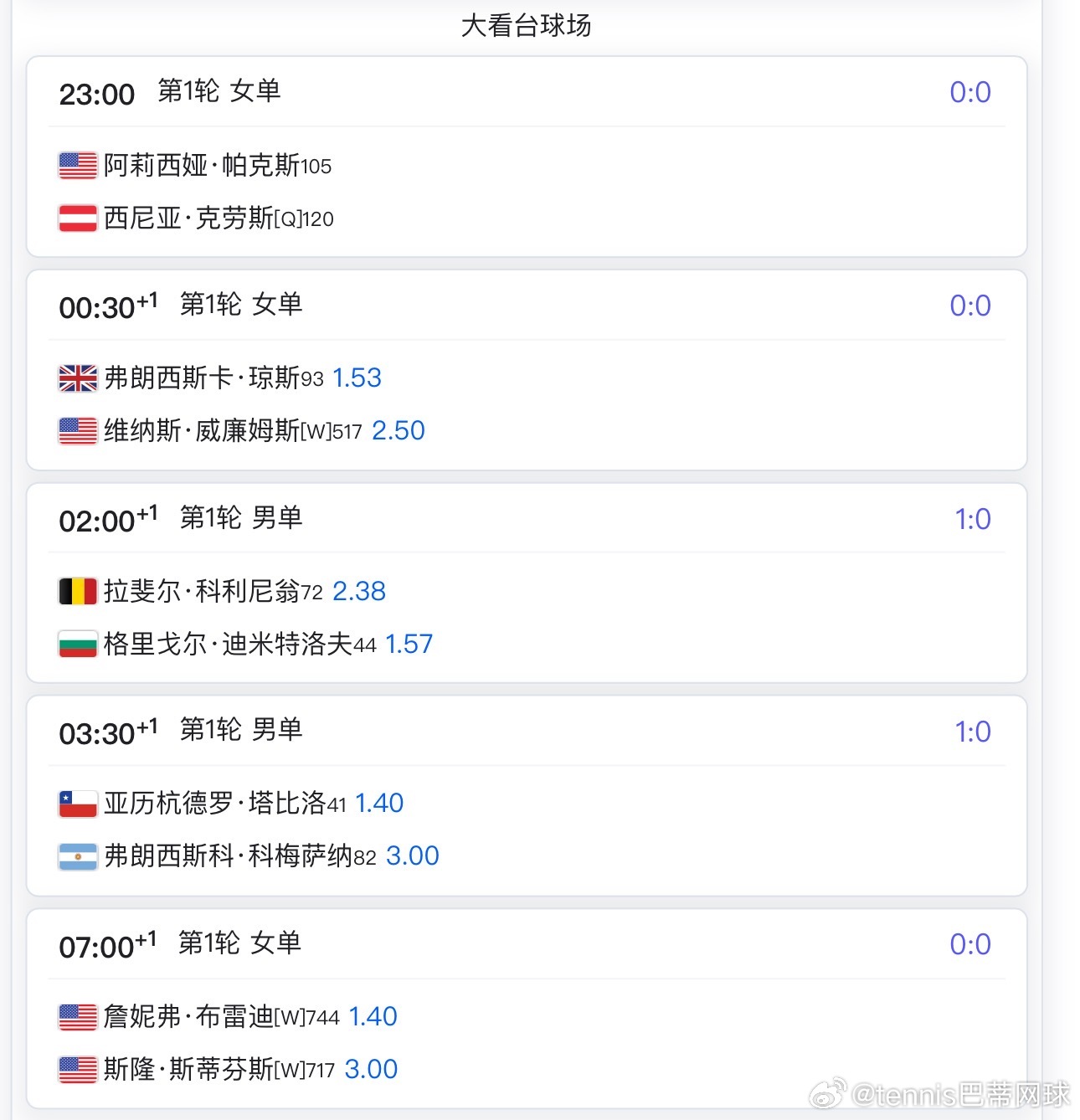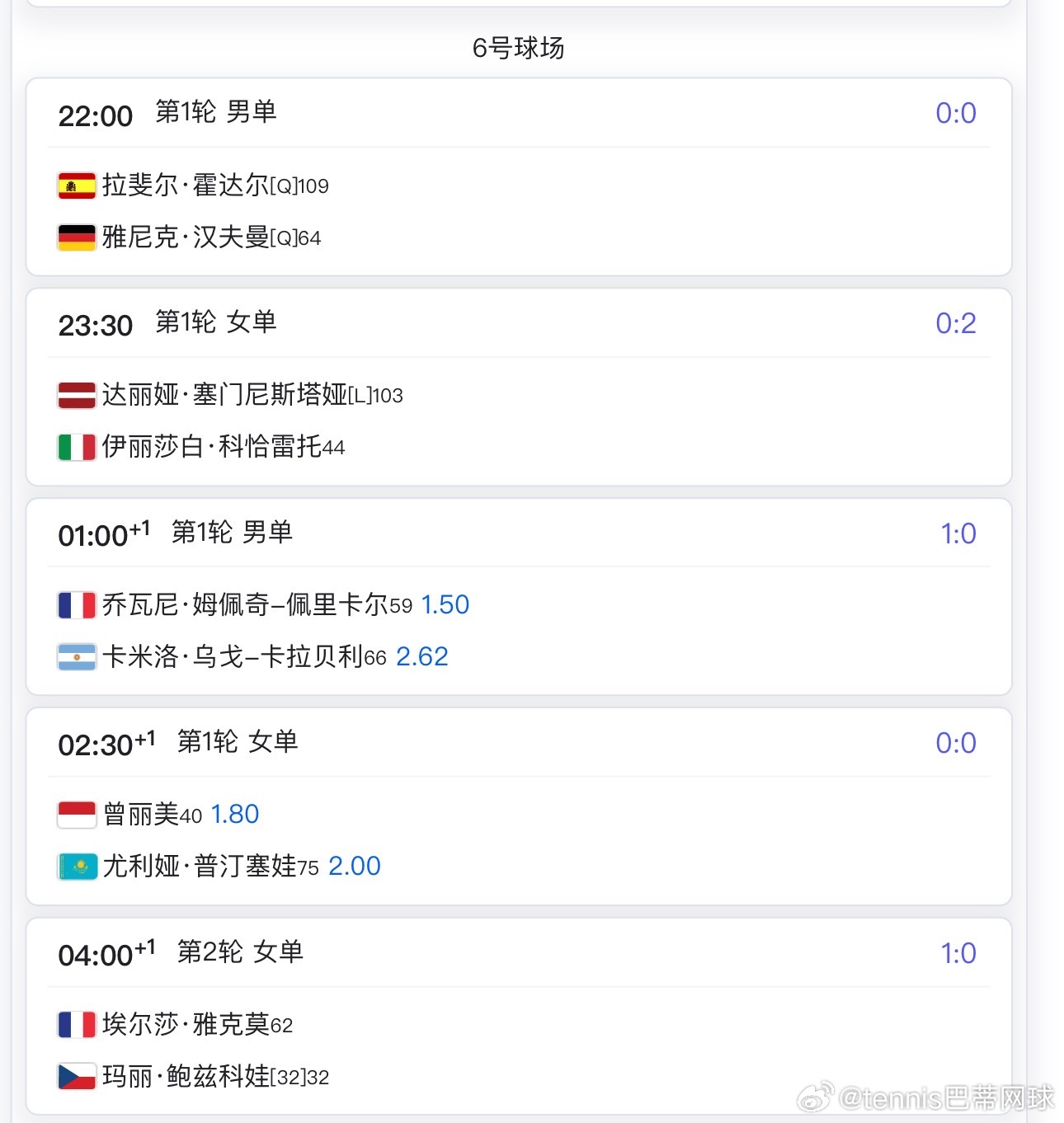 其他具体比赛可以看下方对应的球场赛程郑钦文🇨🇳,王欣瑜🇨🇳,莱巴金娜🇰🇿,阿尔卡拉斯🇪🇸等的比赛要明后天了wta