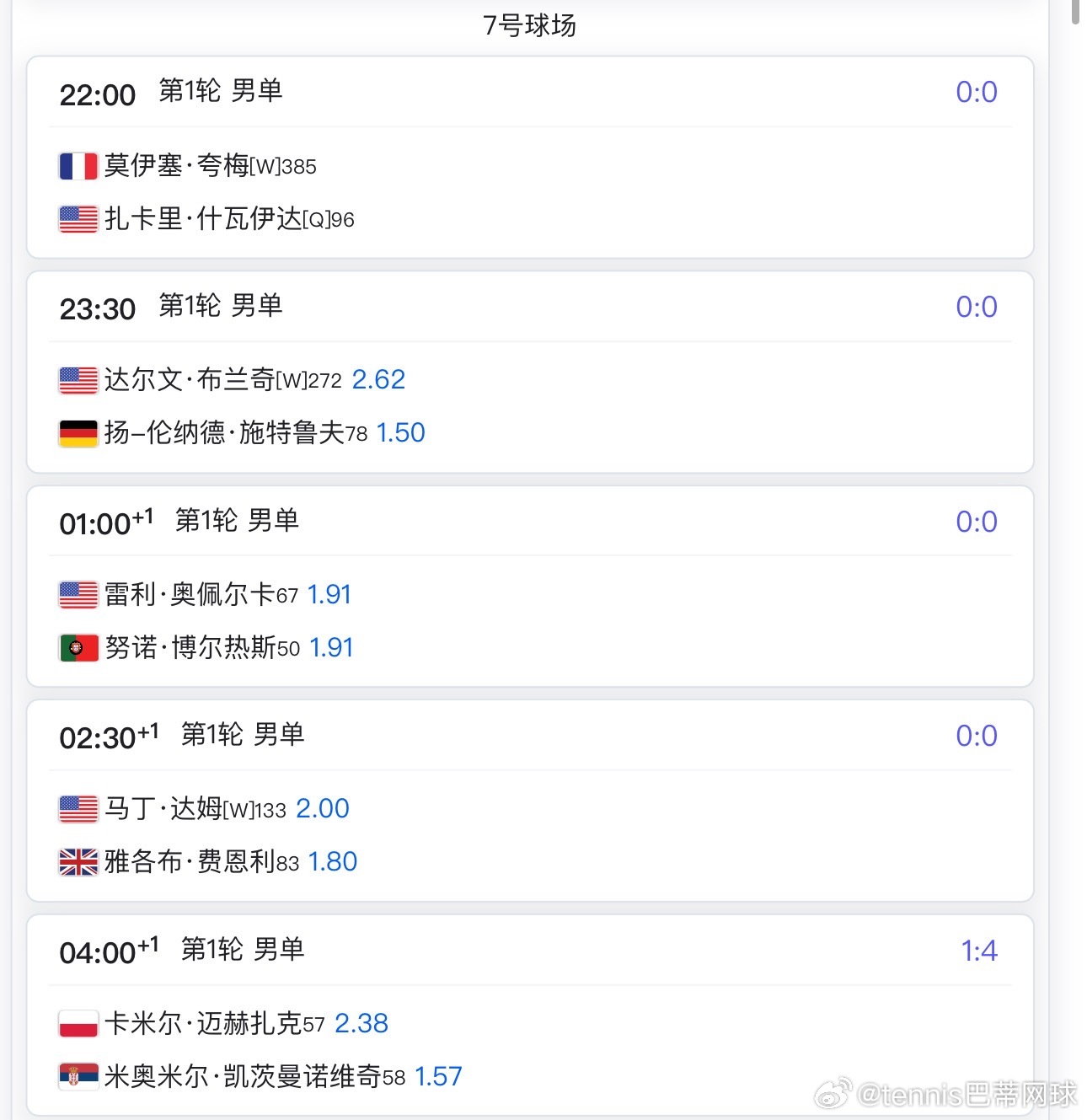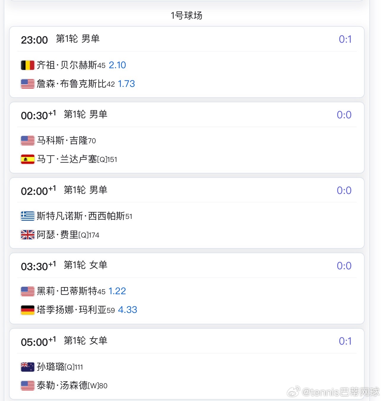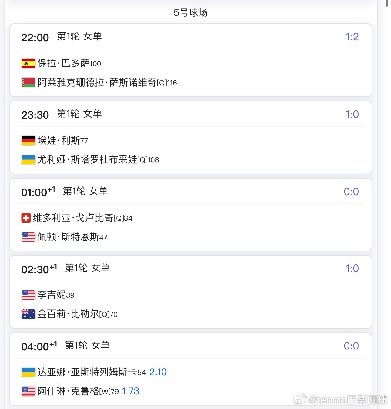 其他具体比赛可以看下方对应的球场赛程郑钦文🇨🇳,王欣瑜🇨🇳,莱巴金娜🇰🇿,阿尔卡拉斯🇪🇸等的比赛要明后天了wta