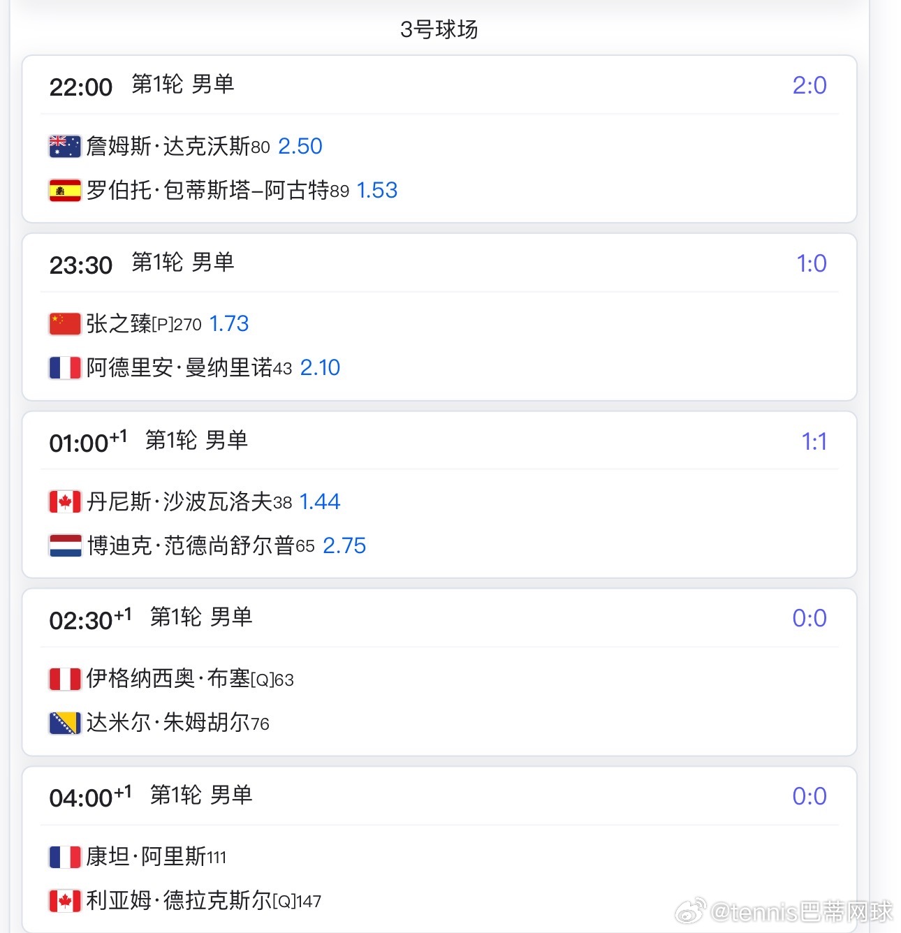 三号球场第二场晚上不早于23:30张之臻🇨🇳vs马纳里诺🇫🇷