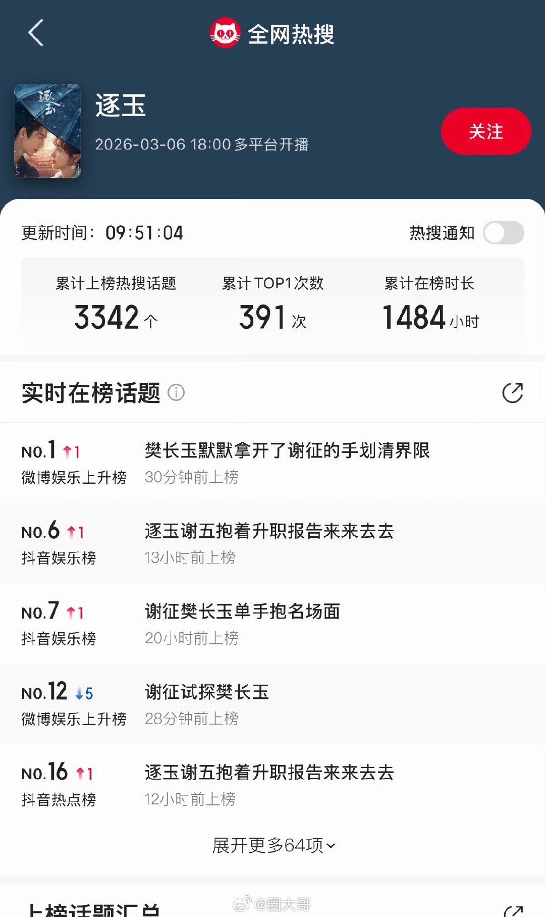 张凌赫田曦薇逐玉登热搜榜次数张凌赫田曦薇《逐玉》想要超过《庆余年》和《狂飙》的热度,也是早晚的事吧,从开播到现在,张凌赫田曦薇《逐玉》相关的全网热搜数3342个,看得出来热度和人气拉满了!张凌赫田曦薇全网热搜数3342个