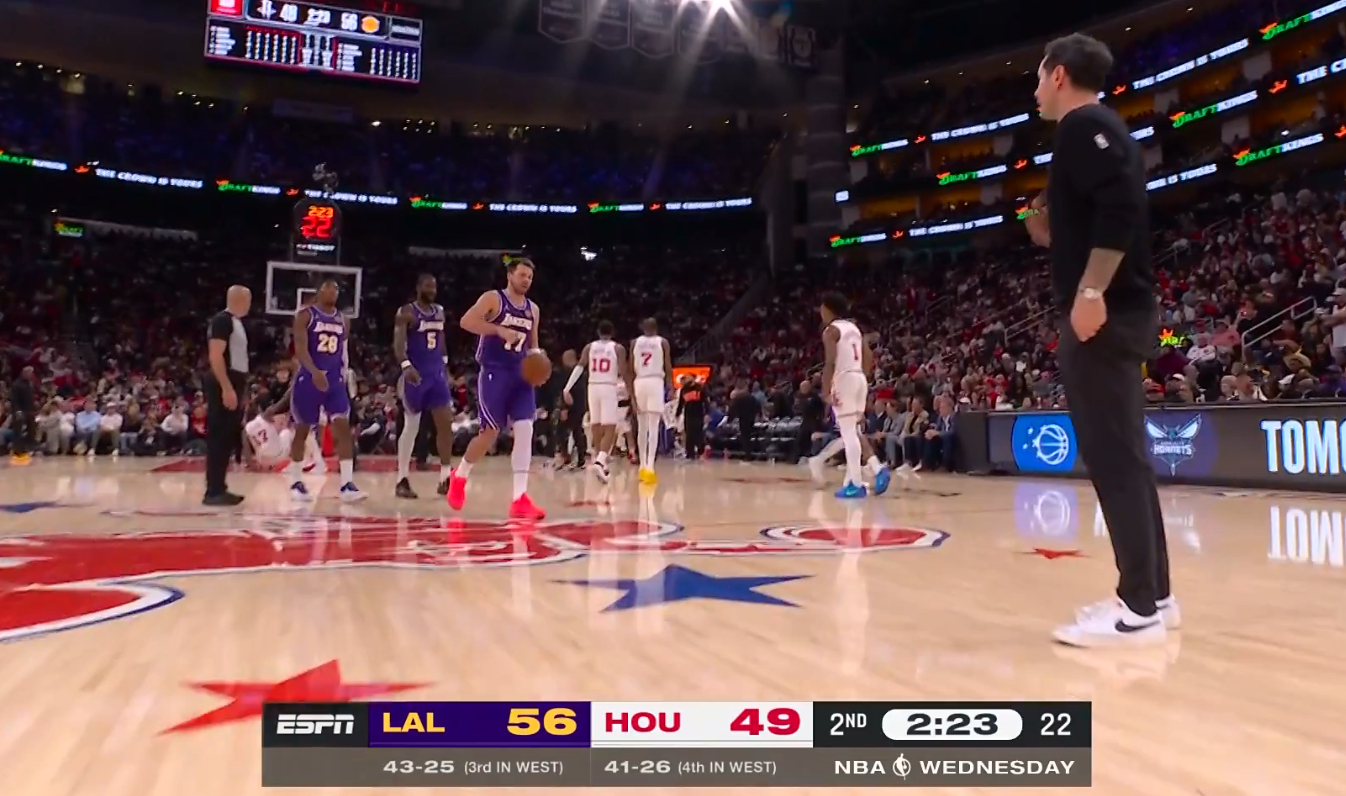 东契奇够拼,与对方拼篮板拼地板球,拿到球以后喊出暂停,56-49,第二节还有2分33秒