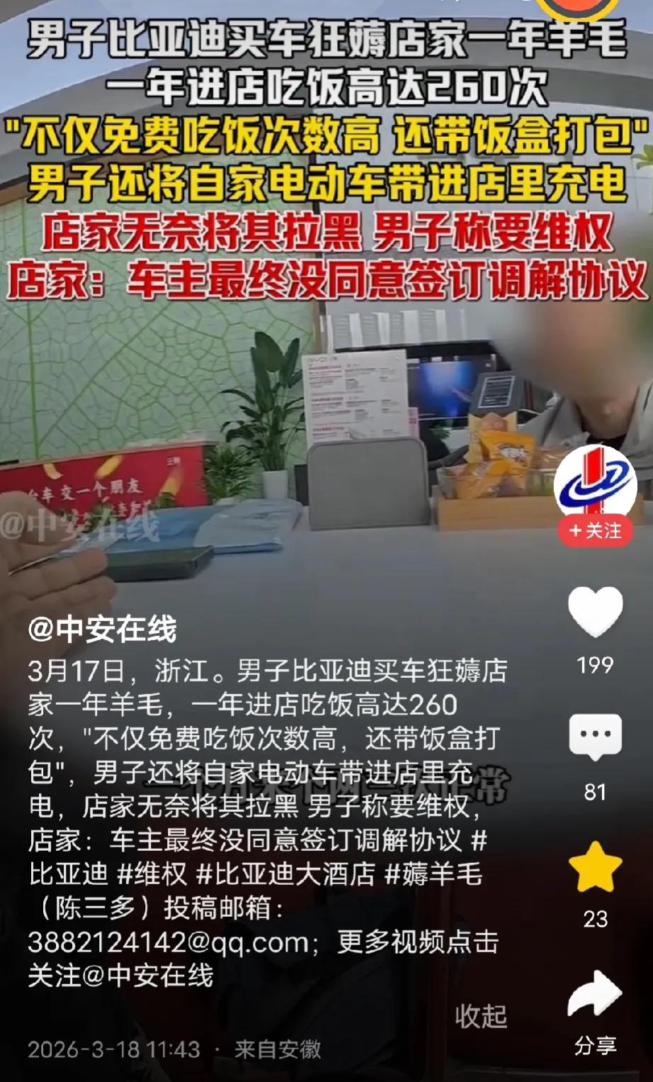 浙江,男子在4s店买了一辆比亚迪,店员承诺:可以免费吃饭、充电、洗车。男子高兴坏了,天天一到饭点就跑来吃饭,吃饱喝足后还拿饭盒打包回家,一年365天来了260多天,更过分的是,他不仅给汽车充电,连家里的电动车也扛来店里充电,4s店忍无可忍拉黑了男子,没想到,接下来男子提出更过分的要求。 2024年9月,浙江的庞先生在当地一家比亚迪4S店购置了一辆汽车,成为了该店的客户。 为了回馈新老客户、提升销量,这家4S店当时推出了十分诱人的福利政策,明确承诺凡是在店内购车的客户,都可以免费享受吃饭、洗车、充电服务,而且不限次数,除此之外,还额外赠送了多次保养卡。 这样的承诺,让庞先生喜出望外,也成为了他最终选择这家店的重要原因之一。 谁也没有想到,这份诚意满满的福利,后来竟成为了4S店的“噩梦”。 庞先生自从购车后,便把4S店的免费福利当成了自己的“专属福利”,丝毫没有客气。 从2025年开始,他几乎每天饭点都会准时出现在4S店,一顿不落,一年下来,进店用餐的次数足足有260多次,平均每1.4天就来一次,相当于一年里有三分之二的时间都在4S店蹭饭。 更让人难以接受的是,庞先生不仅自己在店里吃饱喝足,还特意从家里带来饭盒,每次用餐结束后都会打包一份带回家,俨然把4S店当成了自家的免费食堂。 除了蹭饭,他对免费充电的福利也“物尽其用”,不仅每天给自家的比亚迪汽车充电,还偷偷把家里的两轮电动车藏在汽车后备箱里,带到4S店的员工充电区充电,刻意规避店员的注意,只为节约自己的家用开支。 其实,4S店当初承诺福利时,原本预期客户只会偶尔享受,正常情况下,大多数客户每月也就来个两三次,甚至有不少客户从来没有主动使用过这些福利。 面对庞先生如此频繁、过度的薅羊毛行为,4S店的员工一开始因为有承诺在先,只能敢怒不敢言,没有明确阻止,这也让庞先生的行为变得愈发肆无忌惮。 矛盾的爆发,发生在2026年初的3月份。 那天,庞先生像往常一样来4S店充电,却没有按规定停放车辆,反而将车直接停在了店内的新车交付专区,这一行为明显违反了4S店的相关规定。 店员发现后,连忙上前好意提醒他挪车,可庞先生不仅拒不配合,还态度恶劣地辱骂店员“狗拿耗子多管闲事”,双方随即发生了激烈争执,甚至升级为肢体冲突,双方都有不同程度的受伤。 冲突发生后,庞先生第一时间报了警,为了息事宁人,4S店无奈之下主动赔偿了庞先生500元,本以为这件事能就此平息,可庞先生却没有丝毫收敛。 面对庞先生无休止的纠缠,4S店彻底忍无可忍,最终决定拉黑庞先生,停止为他提供任何服务,彻底切断这场无休止的“薅羊毛”闹剧。 让人没想到的是,被拉黑后的庞先生不仅没有反思自己的行为,反而变本加厉,提出了更过分的要求。 他声称4S店违背了当初的承诺,要通过法律途径维权,还明确要求4S店将4张价值398元的保养卡全部折现给他,否则就继续在店里纠缠,影响4S店的正常经营。 为了解决矛盾,4S店先后提出了两套调解方案,一套是一次性买断庞先生的维修基金和保险券,双方从此两清,不再有任何交集;另一套是将保养卡折现,并安排另一家4S店继续为庞先生提供当初承诺的免费福利。 可庞先生的态度却反复无常,先是当场同意了买断方案,转头就反悔,后来又拒绝签署任何调解协议,甚至还邀请了有一定粉丝量的博主上门曝光调解,最终双方多次协商都不欢而散,矛盾进一步激化。 这件事里,双方都有值得反思的地方。 4S店当初的承诺不够严谨,没有明确福利的使用边界;而庞先生则是过度索取,把商家的诚意当成了自己占便宜的资本,最终闹得两败俱伤。 截至目前,庞先生和4S店的矛盾依然没有得到解决,双方依旧僵持不下。 一场原本简单的购车福利,最终演变成这样的闹剧,也给所有商家和消费者提了个醒,商家促销需谨慎,明确福利边界; 消费者享受权益要理性,懂得适可而止,唯有相互尊重、彼此体谅,才能避免这样的矛盾再次发生。