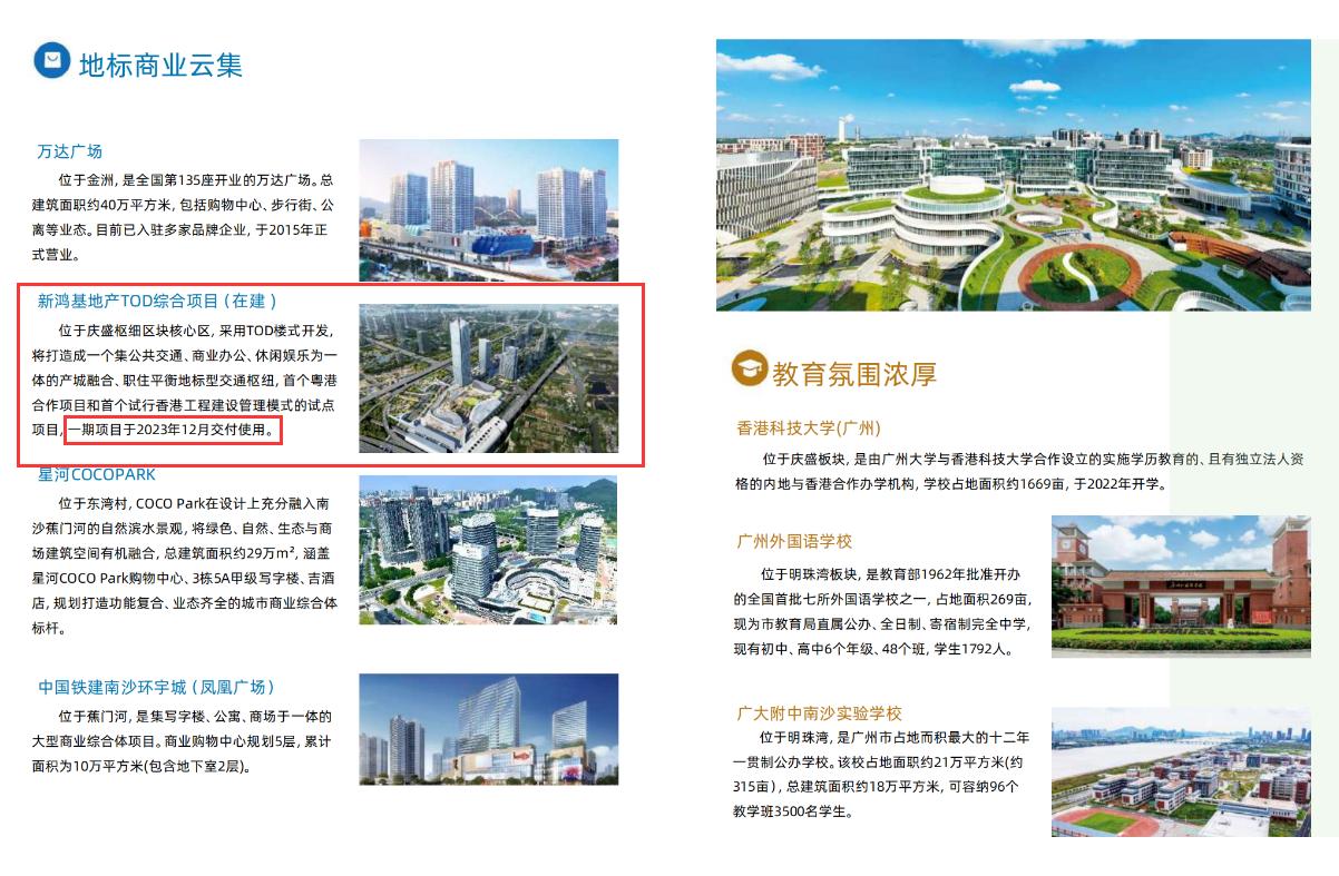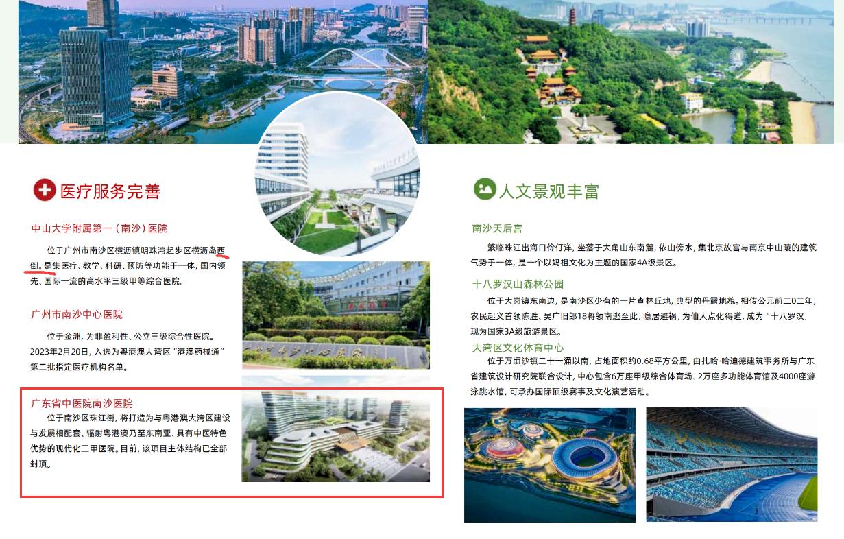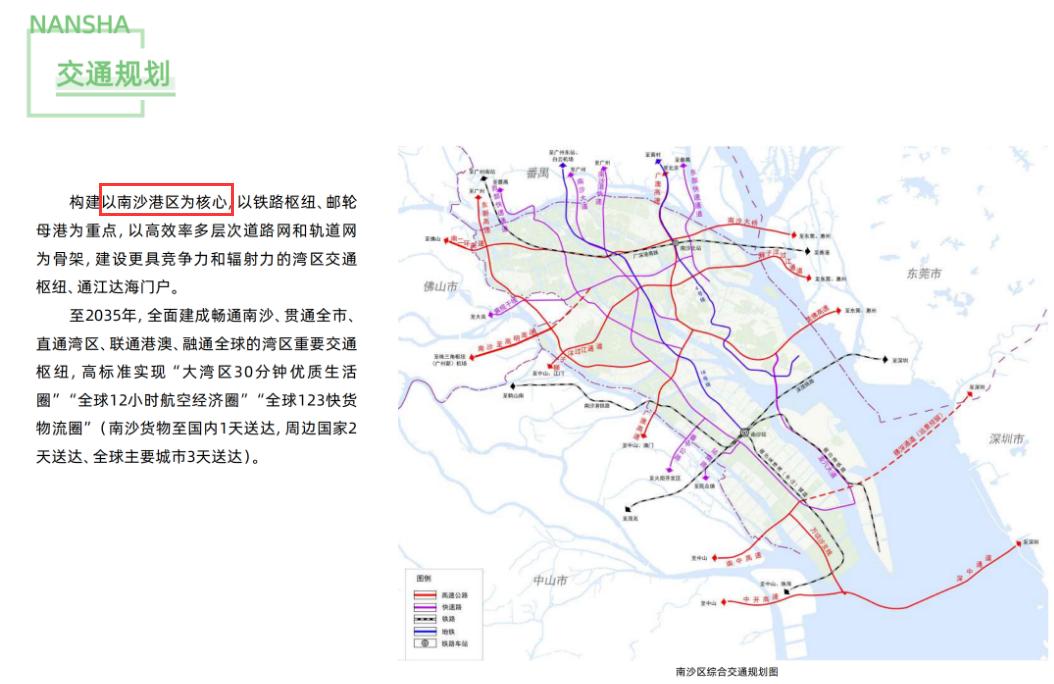 广州2026年蓝皮书新鲜出炉,各区都在蓝皮书不多的章节里面拿出了自己的看家本应。而南沙区今年在蓝皮书中重点介绍了庆盛、明珠湾起步区、南沙湾板块。更加意外的是,大岗镇首次被单独拿出来介绍。 不过和往年一样,这份有点宣传意味的蓝皮书,总会出现一些小的瑕疵和细节,一起来看看眼尖的小编看到了哪些彩蛋吧! 南沙远期目标:至2035年,南沙区全球高端资源要素集聚、辐射带动能力显著增强,携手港澳建成高水平对外开放门户,成为粤港澳全面合作的重要平台。产业创新能力达到国际一流水平,建成国际科技成果转化高地。公共服务和生态宜居达到世界先进水平,建成活力、智慧、韧性的现代化滨海新城,成为引领广州建设国家中心城市的高质量城市发展标杆、大湾区高质量发展能量核心和中国式现代化浓缩的精华。 交通规划:交通规划是比较意外的,竟然说是以南沙港区为核心,以铁路枢纽、邮轮母港为重点。很明显南沙港区、邮轮母港目前的交通并不方便。 配套:配套方面,学校列出了7个,医院方面没有开业的广州妇幼南沙和省中医南沙也列了进去。商业中心就更加奇特了,老旧时期的金莎广场、奥园中环、华汇都榜上有名,甚至还有错别字金洲广场(正确的应该是今洲广场,现在新名字是今洲新天地)。商场没开业的新鸿基地产TOD综合项目也加入了进去,还写明2023年一期已经交付使用。文化休闲方面,南沙湿地都改名大湾区中央湿地公园了,还留着旧的名字。