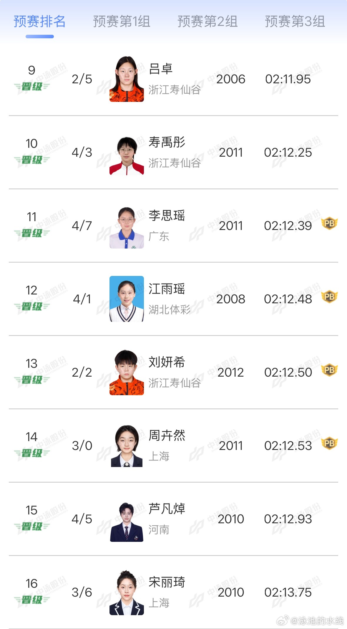 吕卓 2:11.95寿禹彤 2:12.25李思瑶 2:12.39 PB江雨瑶 2:12.48 PB刘妍希 2:12.50 PB周卉然 2:12.53 PB芦凡焯 2:12.93宋丽琦 2:13.75