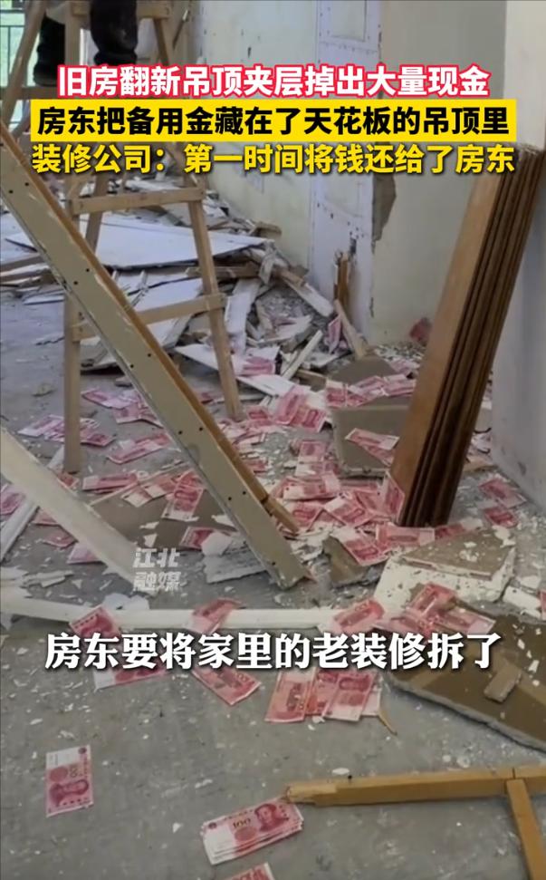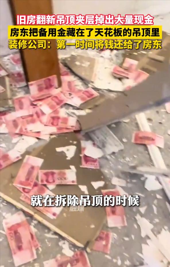 3月18日报道,四川成都,一男子到客户家中进行翻新,不料,在拆除吊顶时,突然下起了“钞票雨”,红彤彤的百元大钞散落一地,后来一问客户才知道,原来他是把私房钱藏在了天花板的吊顶里,结果忘到脑后了[太阳] 近日,成都装修师傅周师傅在拆除一处旧房吊顶时,撬开石膏板的瞬间,大量百元钞票扑面而落,铺了一地。 他没有丝毫犹豫,第一时间喊停所有工人,禁止任何人触碰现金,原地看护等候,随即拨通房主电话告知情况。 房主赶到现场愣神几秒后,猛然想起这是自己多年前亲手藏进吊顶夹层的一笔钱,早已彻底遗忘。 经现场清点,金额为2万余元,因为藏匿在吊顶灯槽夹层,位置过于隐蔽,加之时隔多年,房主本人早已彻底忘记这笔钱的存在。 周师傅事后接受采访表示,自己从事装修行业十几年,墙缝里翻出老照片、旧粮票、旧报纸是常事,但一次性发现这么多现金还是头一次。 他坦言自己没有丝毫纠结,因为:“这钱不是我挣的,碰都不该碰”,这句话语气平静,却尽显本分与诚信。 现金藏在家里的习惯,在四五十年代出生的一代人中相当普遍。 不完全是为了防老伴,更多是一种应急心理,有一笔谁都不知道的钱压在底下,心里踏实。 随着移动支付普及,这种行为正在快速消失,但偶尔还是会在拆迁、翻修时,以这种戏剧性的方式重新浮出水面。 这件事真正值得记住的,不是钱本身,而是一个普通工人面对意外时做出的那个普通选择,停手,打电话,等着。没有犹豫,也没有侥幸,就这么简单。 一位网友说得实在:“周师傅这人能处!地上好几万,说不动心是假的,但人家第一时间保护现场、联系业主,这品行比金子还珍贵。现在这样的人不多了,必须给周师傅点个大大的赞!” 还有网友一看就乐了,评论说:“这大哥藏私房钱的水平,绝对是王者级别的!别人藏钱顶多被媳妇找到,他倒好,直接把自己给骗过去了。” 话说回来,您家里有没有过这种意外的发现?是在老房子的某个角落,还是在一件旧家具里,翻出了被遗忘的宝贝?