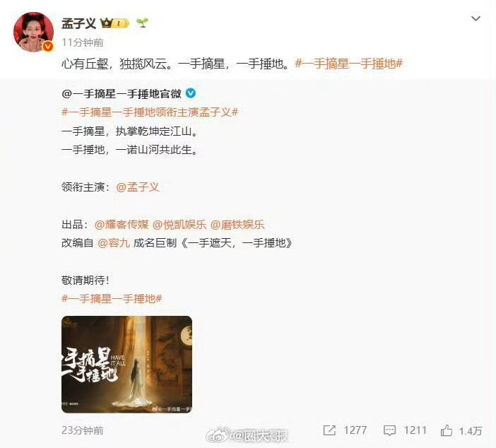 孟子义一手摘星一手捶地男主孟子义官宣新剧《一手摘星一手捶地》后,大女主排面拉满了,不过新剧男主还未官宣,不少网友猜测孟子义演带新人了,不过男主人选还挺多的,丁禹兮、李昀锐、董思成、张开泰等,会是谁啊!曝孟子义一手摘星一手捶地带新人