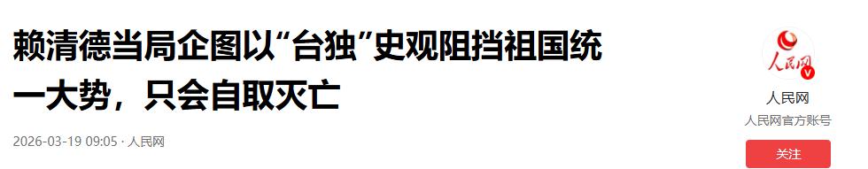 中东彻底乱了,连环暗杀让人头皮发麻。谁能想到,就在这节骨眼上,赖清德居然又跳出来作妖了。他到底干了什么,惹得咱们外交部囯台办囯防部同时发声? 现在全世界的目光都被中东吸走了。美国、以色列和伊朗的冲突硬生生拖到了第20天。以色列接连暗杀了伊朗国安委秘书和情报部长。整个国际社会都被这种连环暗杀的阴影笼罩着,动荡不安。 也就是在这国际局势下,赖清德似乎觉得自己又行了。他频繁抛出极其荒谬的言论,疯狂试探两岸的底线和红线。这种火中取栗的危险做派,理所当然地引发了大陆的高度警惕与集中反制。 就在3月18日这一天,咱们的外交部、国台办和国防部,三大权威部门同时发声。矛头直指赖清德和台当局的错误言论。这绝不是巧合,而是对“台独”势力的雷霆警告。 赖清德居然公开宣称,日本当年殖民台湾是为了推动所谓的“东亚共荣圈”。外交部发言人林剑直接把话挑明了。这种公然用侵略者的谎言美化血腥殖民统治的行径,是对历史的严重亵渎。 这彻底暴露了赖清德“媚日卖台、谋独挑衅”的丑恶嘴脸。八十多年前,台湾同胞好不容易才摆脱殖民枷锁回到祖国怀抱。企图用这种荒谬的“台独”史观来阻挡祖国统一大势,只能是自取灭亡。 除了美化殖民历史,赖清德还在疯狂煽动战争恐慌。他妄言台湾要加速建构所谓的“不对称战力”,甚至大放厥词称台湾是“主权民主国家”。这种赤裸裸的挑衅,自然逃不过国台办的严厉痛批。 国台办发言人陈斌华直接指出。台当局的谋“独”挑衅,就是当前台海紧张动荡的根本原因。赖清德和台当局,就是彻头彻尾的“两岸和平破坏者”和“台海危机制造者”。 他们更是唯恐天下不乱的“战争煽动者”。国台办呼吁广大台湾同胞,彻底认清“台独”势力的险恶野心,坚决反对一切分裂行径。两岸同胞必须携起手来,共同维护台海和平与中华民族家园。 更让人气愤的是,台当局连人道主义救援都要抹黑。大陆在中东局势动荡时组织了接侨撤侨行动。结果台当局居然污蔑这是在搞“政治操弄”,甚至借着中东乱局在岛内疯狂施压蓝白阵营。 他们逼迫在野党加快通过高额防务预算审查。国防部新闻局副局长蒋斌掷地有声地回应,大陆每次撤侨都把台湾同胞当家人接回祖国。台当局借机谋取政治私利、图谋“以武谋独”,简直泯灭良知。 这种毫无人性的做法令人不齿,必遭唾弃。看透了这些,我们就能明白赖清德骨子里就是个极度顽固的“台独主义者”。他对大陆的警告置若罔闻,死死抱住美国这根救命稻草当绝对主子。 哪怕现在美军在中东泥潭里越陷越深,赖清德依然像个盲目的赌徒依附美国。面对这样的人,我们必须丢掉幻想。对赖清德讲道理、讲感情无异于对牛弹琴。我们的对台策略必须更加务实强硬。 大陆必须采取“他听得懂的方式”来跟他打交道。不管是强力反制还是其他手段,只要能震慑“台独”就必须果断出手。而且,这一天总会到来的。作为普通老百姓,我们现在最需要的就是保持战略定力。 不管外部局势怎么变,我们都要稳住阵脚。听从国家安排,踏踏实实过好自己的日子。当国家需要时我们必将全力以赴。 十四亿中国人的意志一旦凝聚,必将让赖清德等分裂势力付出最惨痛的代价。