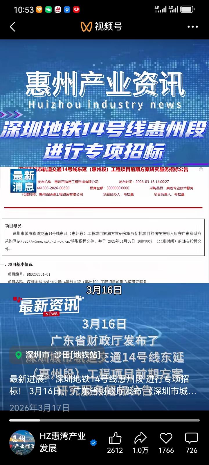 【深圳特区报】深惠跨城地铁再迈关键一步 地铁14号线东延(惠州段)启动前期方案研究招标 近日,一则来自广东省政府采购网的招标公告,让深圳、惠州两地的居民和“通勤族”心动。 公告显示,惠州市惠阳区交通运输局启动“深圳市城市轨道交通14号线东延(惠州段)工程项目前期方案研究服务”的公开招标。备受关注的深惠跨市地铁项目,再次被提上日程。 深圳“十五五”规划纲要草案明确提出,要积极会同兄弟城市大力推进都市圈同城化。加快协同东莞、惠州等共同打造具有全球影响力和竞争力的先进制造业、数字经济等产业集群,推进深惠城际、深大城际等跨市轨道交通建设。 在此战略规划背景下,这项跨市交通项目有了实质性进展。根据广东省政府采购网发布的《深圳市城市轨道交通14号线东延(惠州段)工程项目前期方案研究服务招标公告》,该项目的采购方式为公开招标,采购包预算金额为300万元,投标人应在广东省政府采购网获取招标文件,并于2026年4月8日10时前递交投标文件。 记者注意到,该项目采购人信息为惠州市惠阳区交通运输局,这说惠州市已经启动深圳地铁14号线东延(惠州段)工程的前期方案研究工作,旨在为14号线延伸至惠州提供科学、可行的前期方案。 深圳地铁14号线全长50.3千米,是深圳轨道交通四期工程最长的线路,也是连接深圳市中心区与东部地区的重要交通走廊,途经福田、罗湖、龙岗、坪山四区,共设车站18座。其中,4座枢纽站、9座换乘站,全程运行时间约55分钟,市民乘坐14号线从福田到坪山沙田站仅需40分钟。 14号线东延至惠阳线将极大缩短双城通勤时间,尤其方便每日往返深惠的“跨城族”高度关注的民生工程之一。 项目推进一波三折 公开信息显示,2025年深圳市交通运输局发布了《深圳市交通运输局关于深圳市城市轨道交通13号线北延、深圳地铁14号线东延段就是惠州惠阳段。 2026年1月上旬,对于市民咨询的深圳地铁14号线东延(惠阳段)是否能纳入深圳地铁5期修编,深圳市发展改革委表示,深圳市将与惠州市保持密切交流,开展14号线东延(惠阳段)前期规划研究,积极向国家沟通争取。隔两个月,3月16日,惠州市启动深圳地铁14号线东延(惠阳段)工程项目前期方案研究服务招标,也标志着14号线惠州段建设又被重新提上日程。 招标文件称,本项目为开展深圳市城市轨道交通14号线东延(惠阳段)前期方案研究及必备配套专题工作,争取更有力地体现惠阳区轨交发展诉求,积极推动深圳市城市轨道交通14号线东延(惠阳段)纳入轨道近期建设计划。 对于此次招标,业内专家知名财经评论员刘晓博认为,该项目将对优化完善粤港澳大湾区轨道交通网络、带动沿线经济发展具有重要意义。同时,直接惠及数百万居民的日常通勤,将提升深圳都市圈的综合承载力和竞争力。 刘晓博分析,近年来国家对于新建地铁线路的审批标准不断提高,惠州若以单一城市身份申报地铁新线,目前面临较高门槛。而14号线东延(惠阳段)作为深圳都市圈同城化建设的重点项目,有望借助“都市圈”层面的政策支持,在国家鼓励发展现代化都市圈的导向下深惠联合推动。项目或将成为惠州实现城市轨道交通“零的突破”的关键契机。