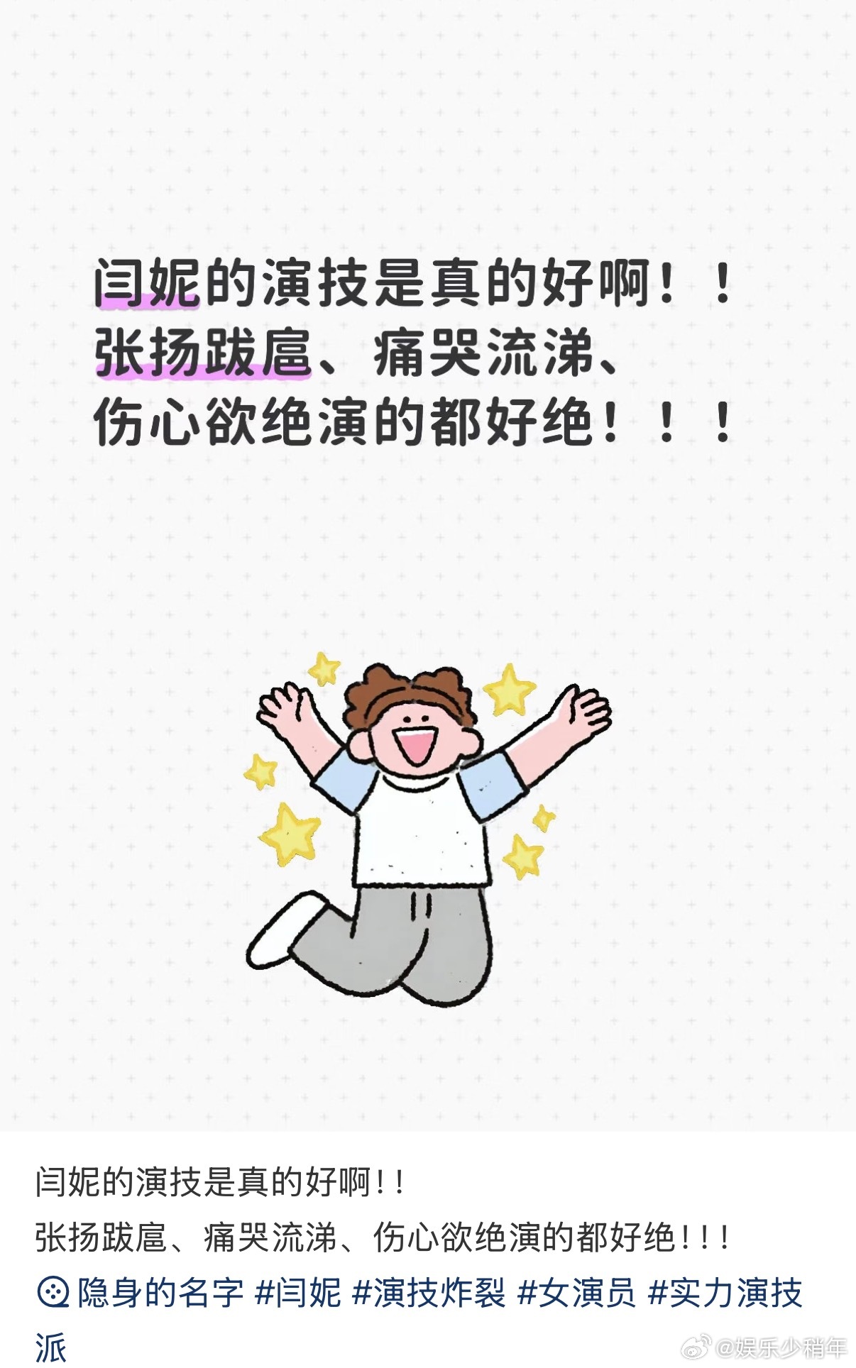 闫妮隐身的名字演技看不出闫妮微醺了闫妮真的把角色演活了!微醺的模样自然到让人以为是真的醉了,将角色的隐忍、挣扎揉进每一个眼神和动作里,台词爆发力十足,情绪表达细腻又真实,这演技真的无可挑剔