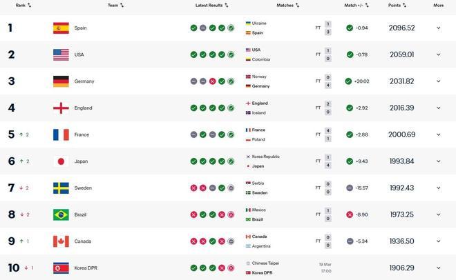 国际足联更新女足实时世界排名,中国女足上升一位位列世界第16位,亚足联排在日本、朝鲜以及澳大利亚之后位列第4位。