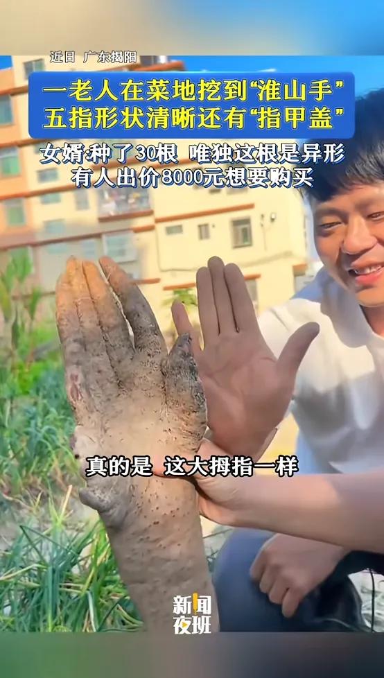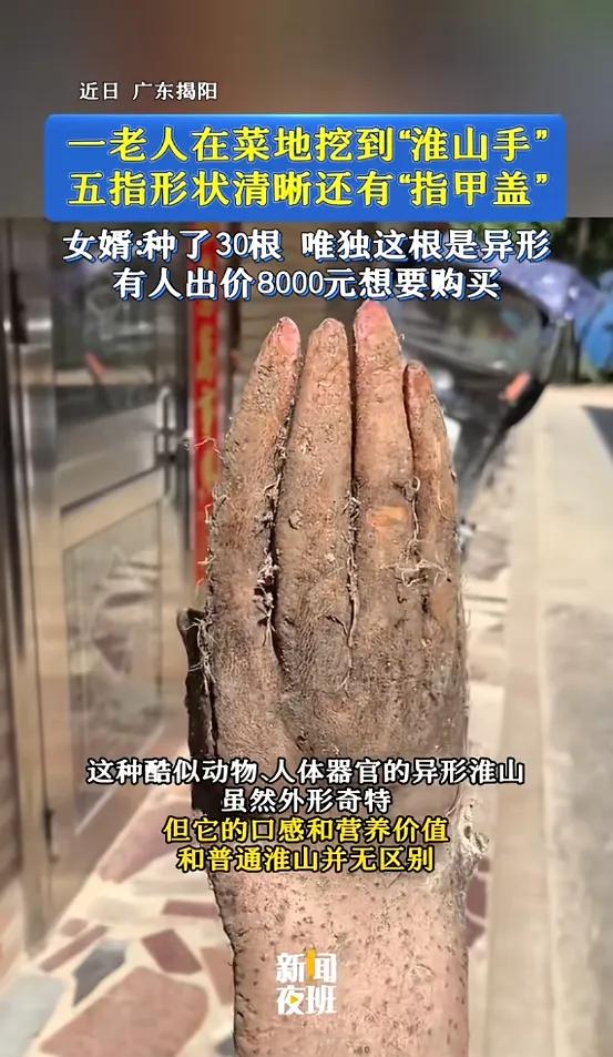 3月18日消息,广东揭阳一老人在自家菜地挖淮山时,挖出一根酷似人手的异形淮山,五指分明且“指甲盖”清晰,老人当场被吓一跳。据悉老人共种30根淮山,仅此一根形态特殊,其女婿黄先生将它发到网上后引发热议,有人出价8000元收购,却被老人一家拒绝。农业专家表示,这是淮山生长受土壤障碍物等外界因素影响形成的自然巧合,其口感和营养与普通淮山无异。 网友评论: 大自然真是神奇,这个手掌型有无五万年历史呢? 称淮山,山药的肯定不是广东人[捂脸][捂脸][捂脸] 假的,肯定是AⅠ。怎么还有指甲? 将山药种放在加厚橡胶手套种植 来源:万象硬核