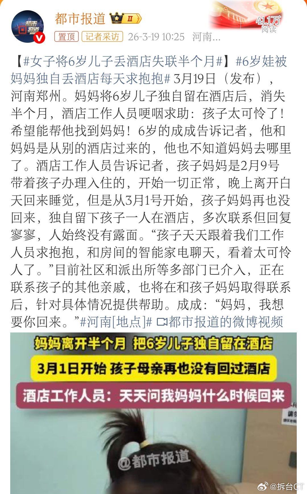 6岁娃被妈妈独自丢酒店每天求抱抱
