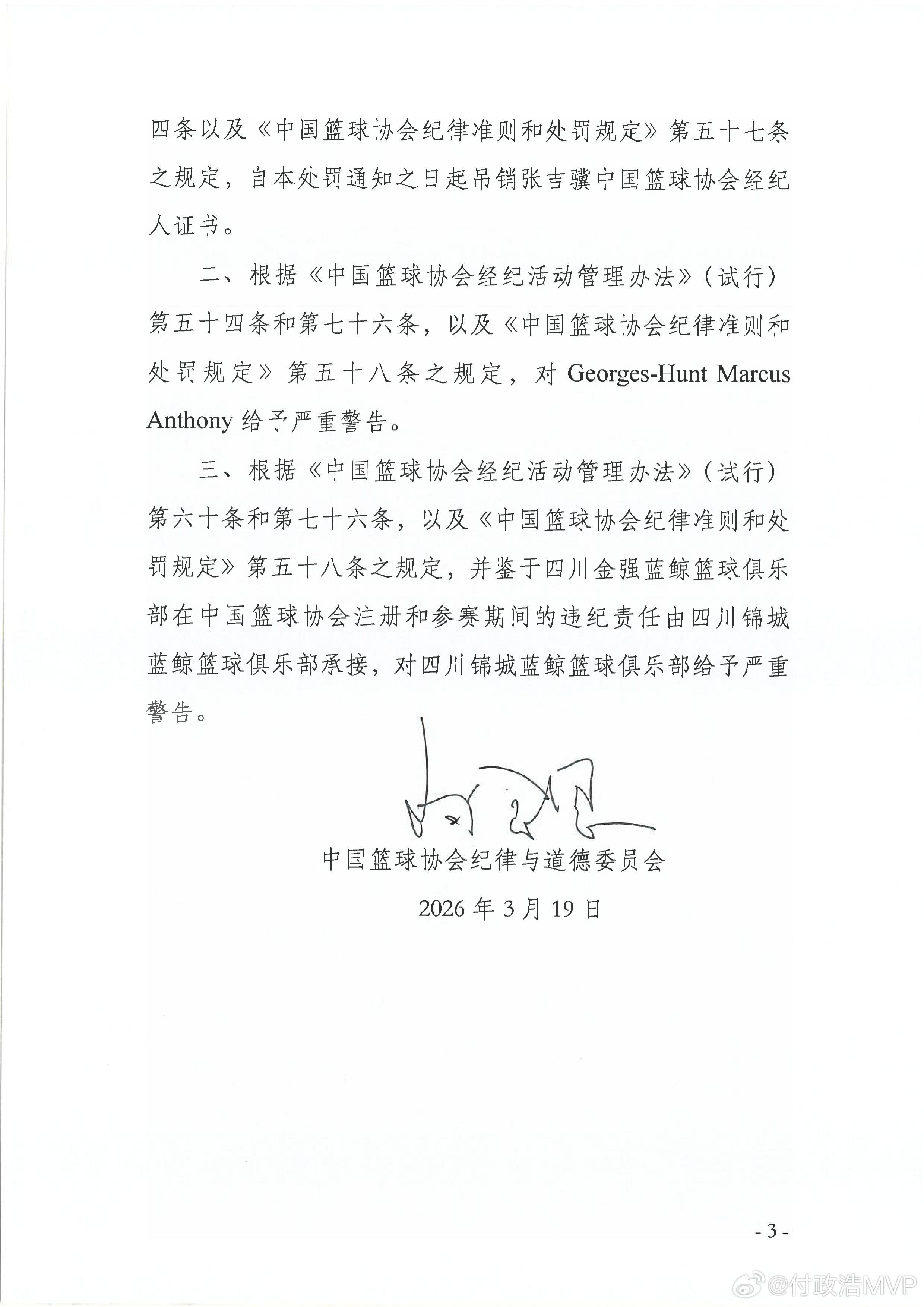 关于四川男篮前外援亨特指控中方经纪人张吉骥伪造阴阳合同一事,中国篮协纪律与道德委员会公布处罚结果,张吉骥吊销经纪人证书,对亨特和四川男篮严重警告。
