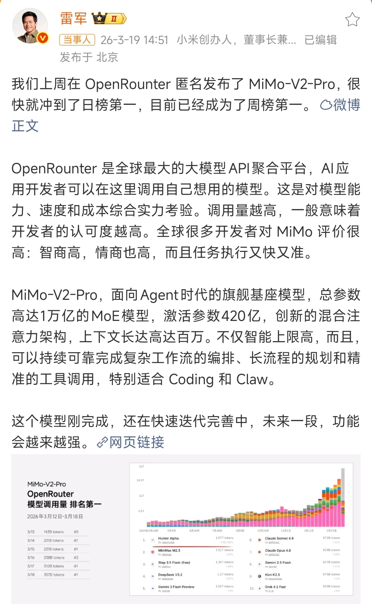 雷军回应大模型火了小米这个万亿参数大模型 Mimo-V2-Pro还没正式官宣,以Hunter Alpha的名字匿名发布的时候,就很快冲到了OpenRounter的日榜第一,后面更是连续好几天屠榜