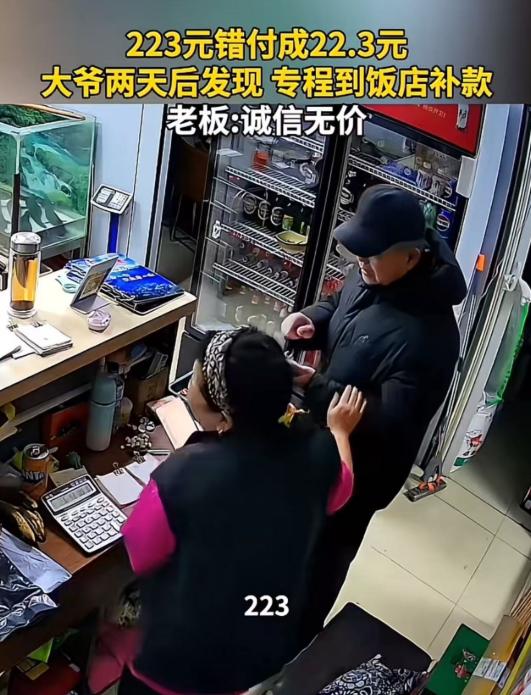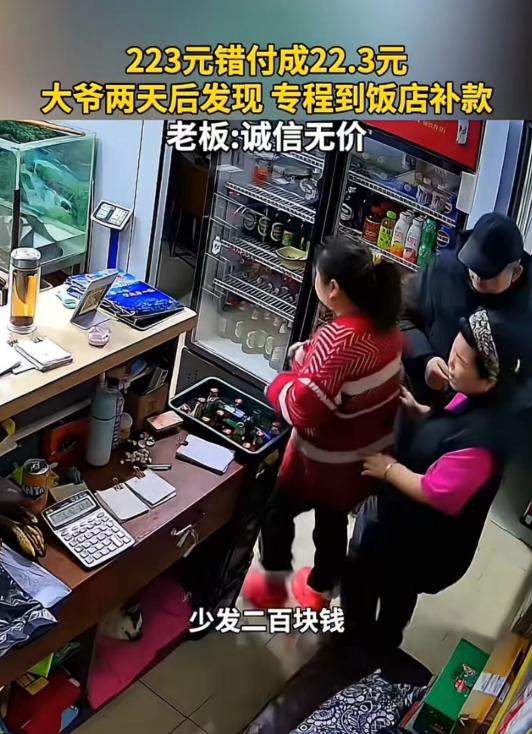 “诚信无价!”大爷来到饭店,跟老板说自己付错钱了,老板下意识地以为他付多了,问大爷多给了多少钱?没想到大爷说:“是我给少了!223元错付成了22.3元!”老板一脸吃惊,钱给少了还特地送过来? 老板正在吧台后面忙着算账,时不时的招呼着新到的顾客,时不时地抬头喊一嗓子,叮嘱后厨加快点速度。 老板眼角余光瞥见有人进来,下意识抬眼看了一下,就看见门口站着的大爷。 大爷没像其他食客那样一进门就东张西望找座位,也没扯着嗓子喊服务员,就安安静静地站在门口的脚垫上。 他的眼神慢悠悠地在店里转了一圈,扫过满桌的食客,又掠过后厨的方向,最后稳稳落在了吧台后正忙活着的老板身上。 老板见他这模样,第一反应就是来吃饭的。 于是她连忙停下手里的活,脸上堆起热乎的笑,扬声招呼:“快里边请!靠窗边还有个空座,您先坐那儿歇歇。菜单就在桌角,您慢慢看,想吃啥直接喊我就行!” 一边说着,一边迈着小步子就想往大爷跟前走,伸手要给大爷引座,生怕慢了怠慢了客人。 没成想,大爷却轻轻摆了摆手,慢悠悠地朝着吧台走过来。 随后,大爷的眼睛看着老板,顿了顿,语气还有点不自然的说到:“我不是来吃饭的,我是来跟你说个事儿。” 老板心里还琢磨着,难道是昨天来吃饭,东西落在店里了?还是菜不合口味? 可看大爷的神情,不像是生气,也不像是着急找东西,倒像是有点不好意思。 只见大爷看着老板的眼睛,认真地说:“实在对不住,我昨天在你这儿吃饭,付错钱了。” 老板干餐饮这行这么多年,这种事她见得多了,大多是客人付钱的时候没注意,多付了几十块或者几百块。 后来发现了,就折返回来找她退差价。 所以老板想都没想,下意识地就问:“没事没事,付错钱太正常了,您说,多给了多少钱?我这就给您退回去!实在对不住,昨天太忙了,也没提醒您一声。” 说着,她就伸手去拿旁边的手机,准备调出昨天的收款记录,核对一下,赶紧把多收的钱退给大爷。 可大爷接下来的话,直接让老板手里的手机顿在半空。 只见大爷轻轻摇了摇头,语气依旧实打实的认真,还带着几分藏不住的愧疚,一字一句地说:“不是多给了,是我给少了。” 老板就那么愣在原地,下意识地往前凑了凑,声音都带着疑惑:“您……您说啥?给少了?” 大爷瞧着老板这副难以置信的样子,又放缓了语气,一字一顿地重复了一遍,脸上的不好意思更重了些。 “对,就是给少了。昨天我在你这儿点了菜,算下来一共是223块钱,我付款的时候,稀里糊涂就给你付成22块3了,差了一大截。” “昨天回家,我翻手机账单,才发现付错了,这一晚上都没睡踏实,脑子里总想着这事,今天就赶紧过来了。” 老板这才彻底反应过来,他赶紧拿起手机,调出昨天的收款记录,快速往下翻,果然看到了一笔22.3元的转账。 她当时太忙了,收完钱就忙着招呼客人、算账,根本没注意到这笔钱的数额不对。 她放下手机,看着眼前的大爷,还是一脸吃惊,嘴里连连念叨:“我的天,大爷,您这……您这也太实诚了。” 大爷听了,摆了摆手,脸上露出一丝朴实的笑容。 在这之后,大爷就开始准备重新转账。 这一幕被发到网上后,没一会儿,就有了很多评论。 有网友留言说:“这才是真正的诚信,不是自己的钱一分不多拿,该给的钱一分不少给。” 也有网友分享自己的经历:“上次我忘付了十几块钱,后来发现赶紧回去补了,老板当时也是很惊讶。”