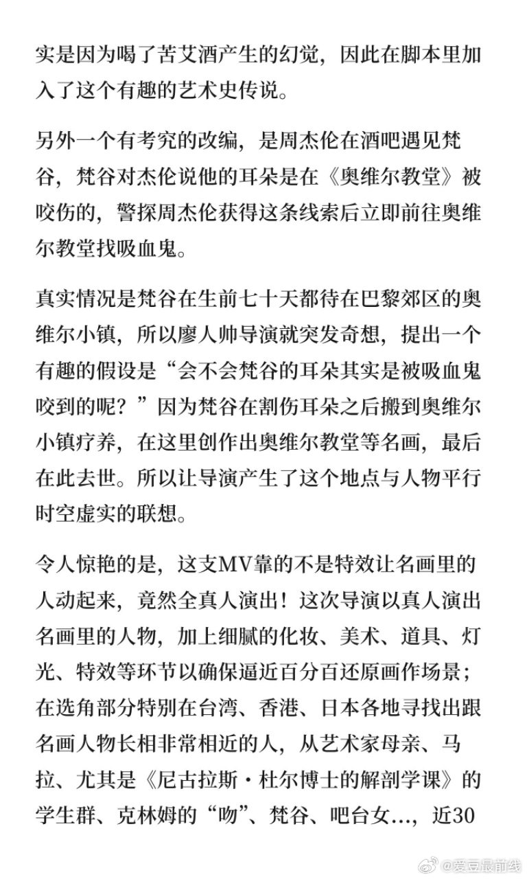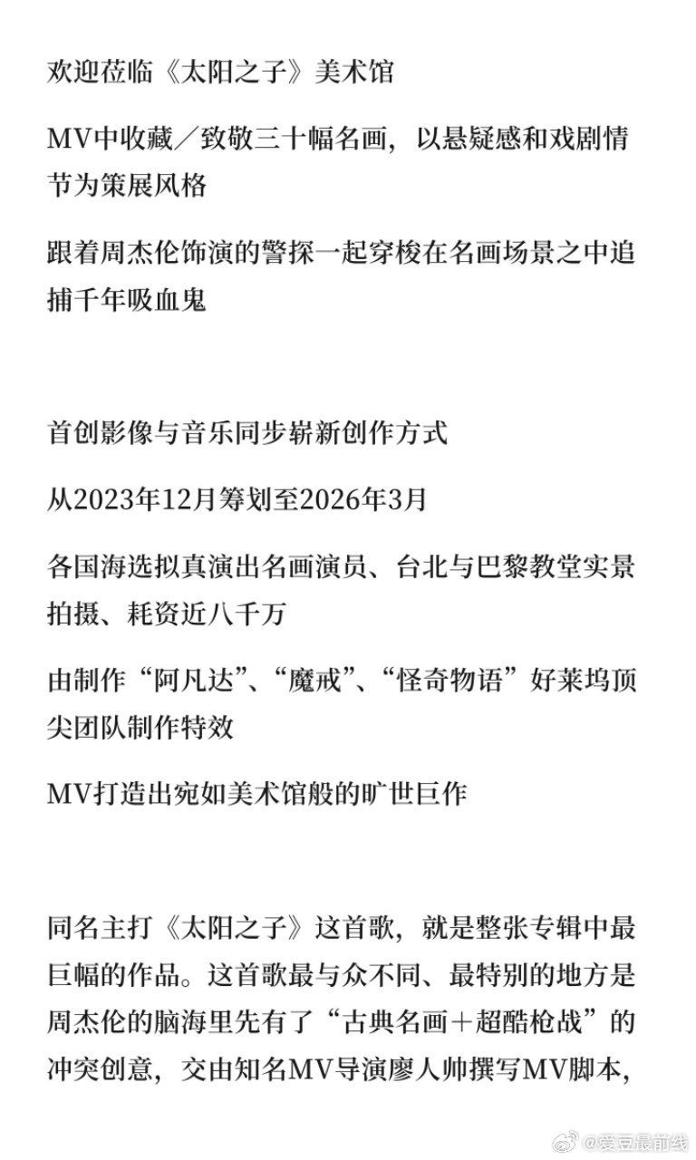 周杰伦太阳之子MV致敬30幅名画 周杰伦在太阳之子MV里饰演警探 周杰伦新专《太阳之子》同名MV居然让三十幅世界名画“活”过来了,而且全由真人出演。从海选相似面孔的演员,到还原画作场景,这支MV在细节上下的功夫让人好奇最终呈现效果,坐等上线!