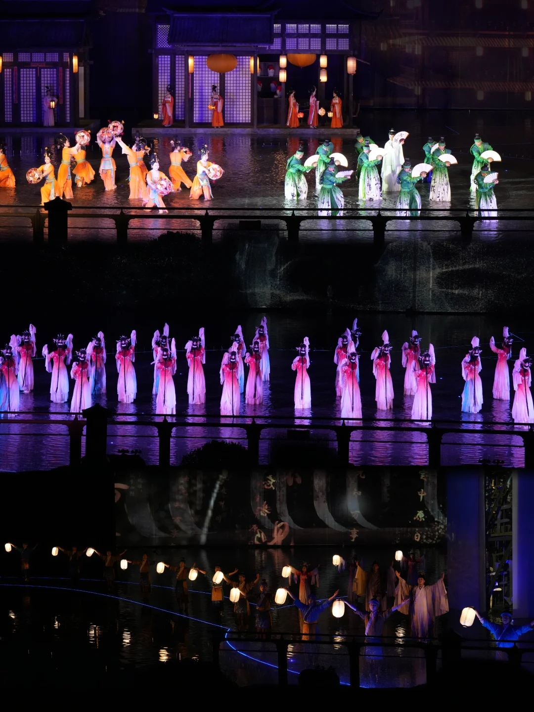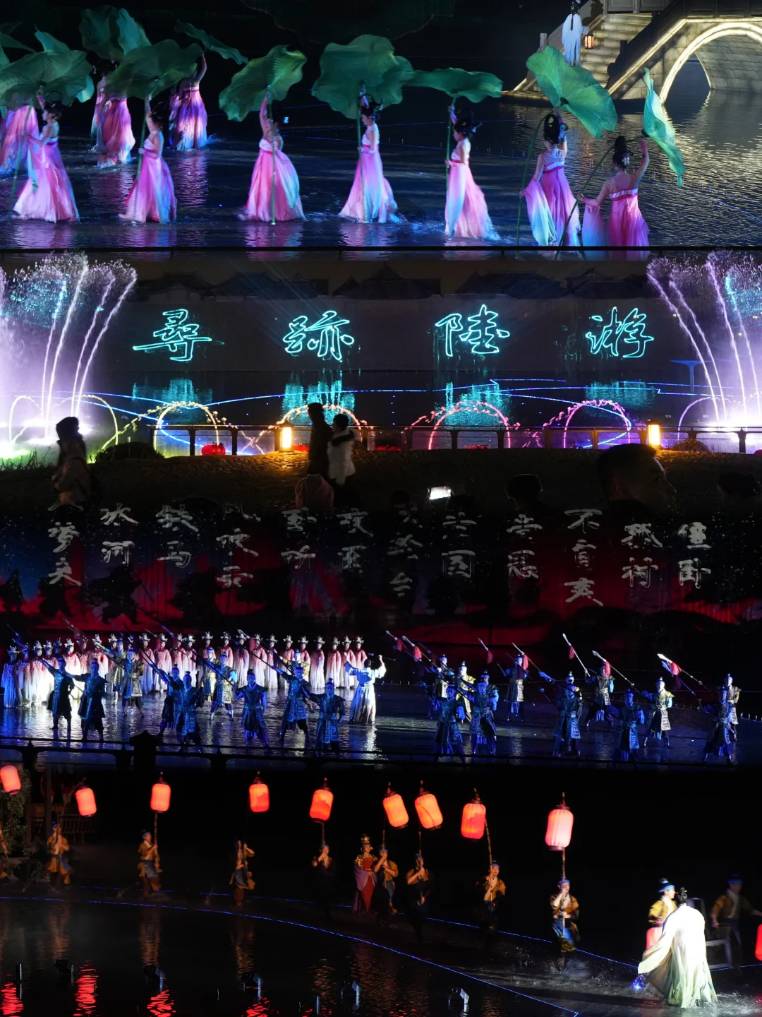 百位演员在中心湖面实景演绎《寻迹陆游》,水幕光影与声光电交织,把「铁马冰河入梦来」的壮阔诗境搬上舞台!
