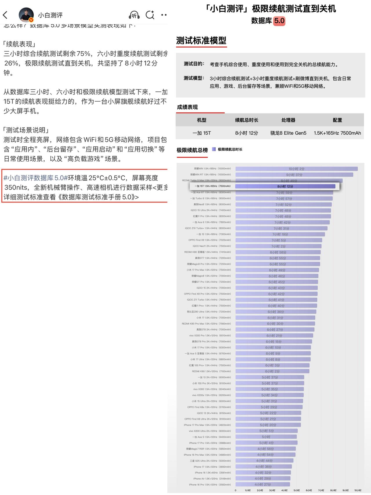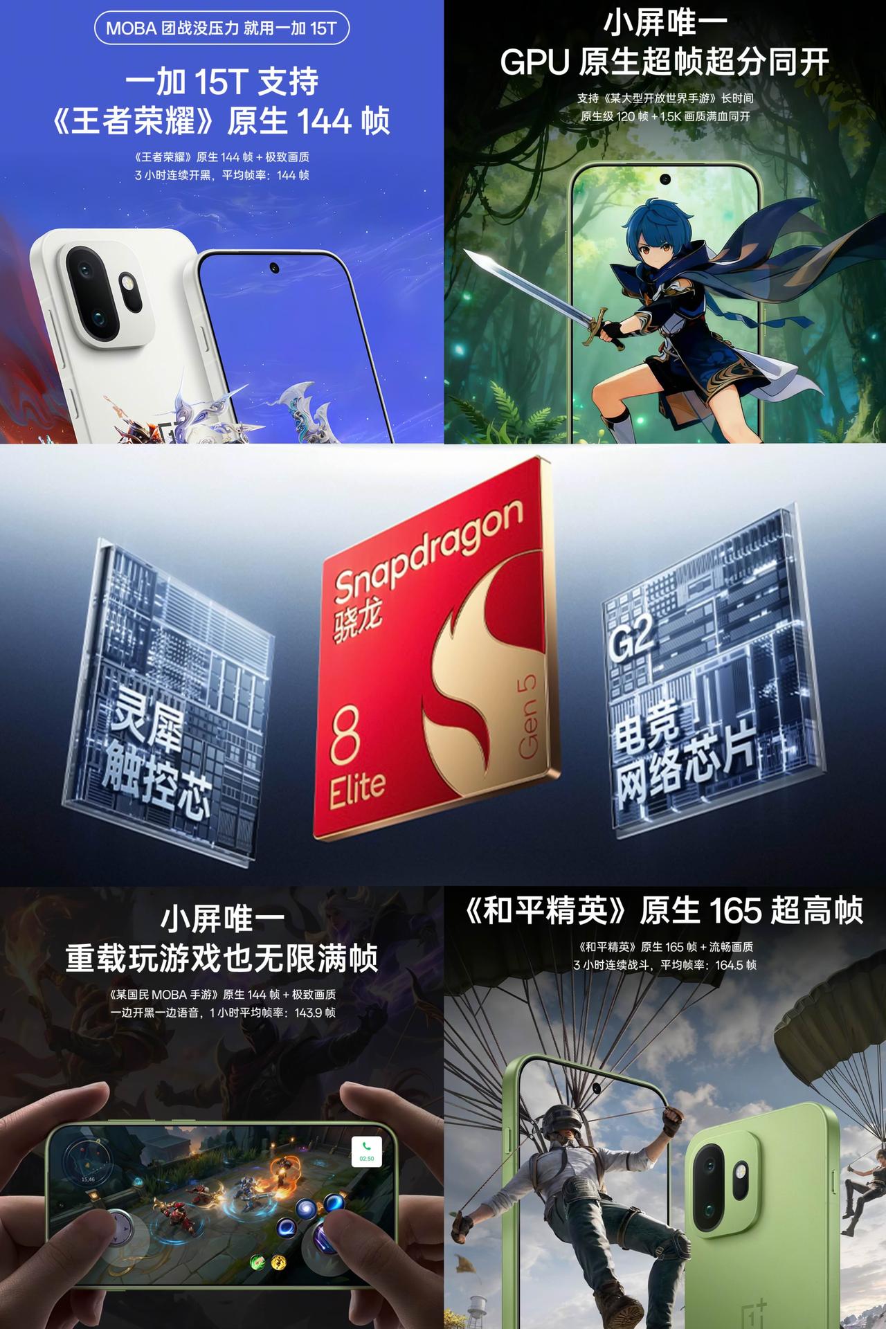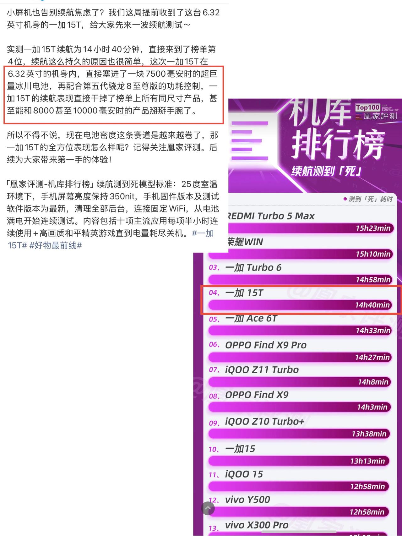 当一加15T续航出来后,估计没几个厂商笑得出来 因为大家发现,这6.32英寸的小机身,电池7500mAh,比一些大屏机容量小,但续航却比大部分大屏机久,且100W充电速度更快... 新评科技实测:7小时33分钟; 小白测评实测:8小时12分钟; 凰家评测实测:14小时40分钟; 实测:从0-100%电量,57分钟充满 怎么说呢,一加15T的调教确实有水平,甚至可以是拔尖的。同为小屏机,多了友商500mAh电池,续航多出来1小时。 你以为这就完了?像小白和新评科技,他们测试项目是包含游戏的,而搭载骁龙8Elite Gen5的一加15T大多数实测游戏是支持165Hz的,较于友商120Hz来说,按理是更费电,结果却打脸了。 我只能说一加15T的「风驰游戏内核」有东西!当然,也别看到小机身就说指定阉割性能了,一加15T电竞三芯一个都不落下。像和平精英支持原生165Hz的,王者荣耀原生144Hz,属于是小屏机里唯一GPU原生超帧超分可以同开的存在[捂脸] 怪不得要找短道速滑大魔王王濛来当认证官呢,没点小屏大魔王的实力,的确还不匹配王濛姐的满贯成就[捂脸]。怎么说呢,一加15T基本把短板都给堵死了,属于是要啥有啥,当然O加系统日用体验也是加分项,心动的建议9.9先人一步咯~总之期待发布会公布价格!