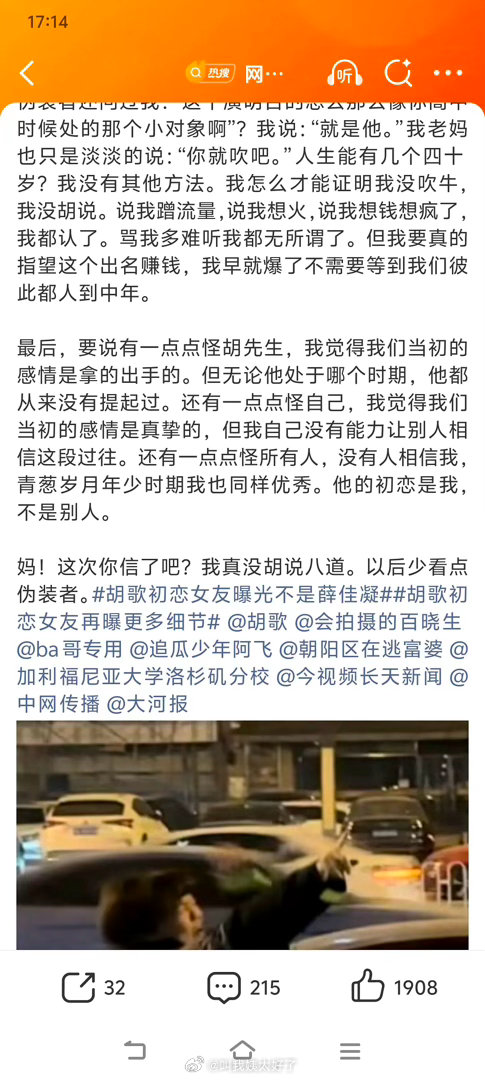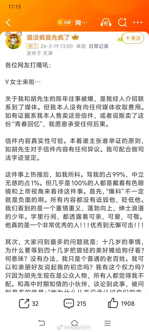 疑似胡歌初恋女友发文