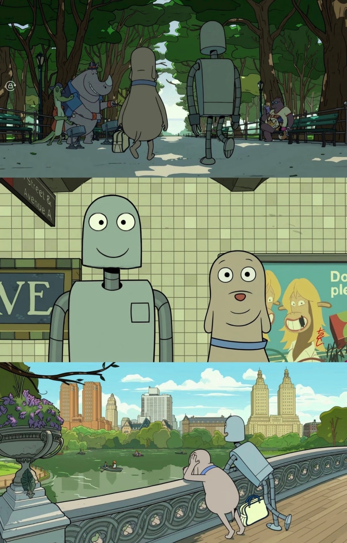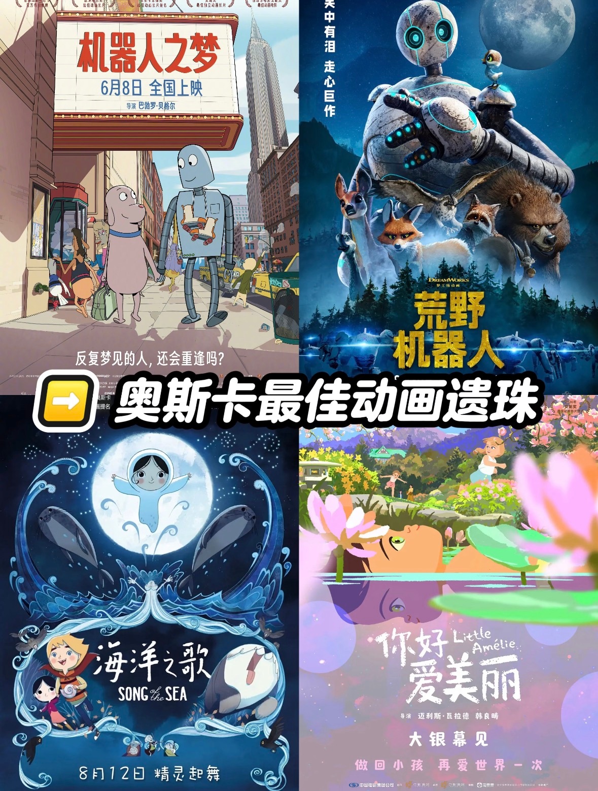 是这部画风独特的法国动画《你好,爱美丽》。动漫点评团海外动漫名场面 它有点像去年的《猫猫的奇幻漂流》,也是欧洲小众动画,也是从安纳西金球奖一路提名到奥斯卡,画风非常有记忆点,特别温柔细腻——整部电影没有很实的轮廓线,全靠色块堆叠来塑形,让一切都有一种朦胧又梦幻的感觉。同时全片色调会随着小女孩爱美丽的情绪流动:她开心时,画面是跳跃的“多巴胺色调”;她迷茫时,世界就蒙上一层灰蓝的薄雾,她伤心时,画面会进一步变成阴暗老旧的色调。包括电影中互为对照组的两位女性,西尾小姐和房东太太,一位是鲜艳的明黄色,一位是深沉阴暗的紫色,主角对于人物的情感好恶也跃然画面。这不只是让“画面好看”,也是用色彩在讲故事,是用纯粹的视觉语言模拟孩童看世界的方式——未经逻辑加工,只有最直接的感官冲击。除了这部《你好,爱美丽》,再看看奥斯卡这些年漏掉了多少真正的好东西:《机器人之梦》:2024年零台词神作,某瓣9.1,社恐小狗和机器人的相遇分离,最后隔空共舞却没有重逢,把“不是所有陪伴都能走到最后”讲得让人无声流泪。《海洋之歌》:耗时7年逐帧手绘的艺术品。导演拒绝透视线,把角色全做成几何图形——圆形代表纯真,方形代表稳重,融合浮世绘、工笔、水墨多种技法,美得像一首诗。《荒野机器人》:把3D做出流动油画感的技术奇迹,机器人妈妈在荒岛养小灰雁,从冰冷的程序执行到生出人一样的情感,探讨科技与自然的共生,温暖又深刻...这些片子都很遗憾没拿奖,但它们都用独特的美学和深刻的情感,获得了观众心中的奖杯?