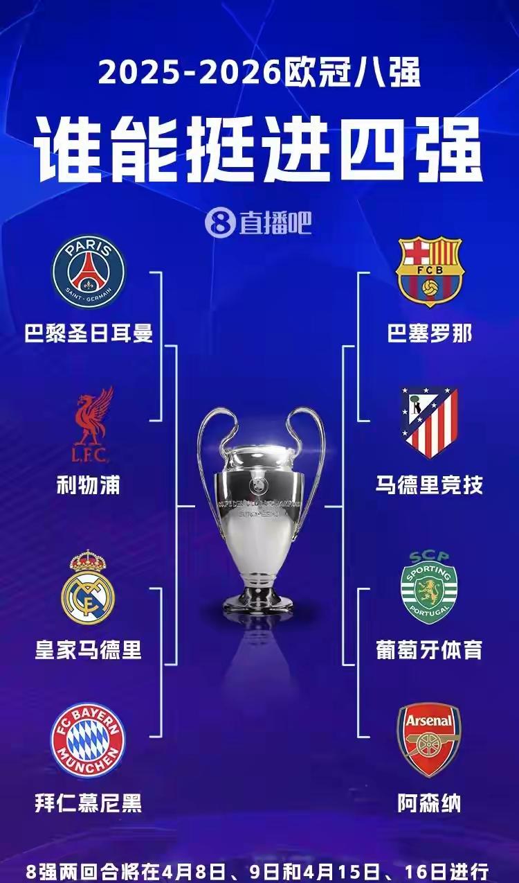 欧冠8强全部出炉:英超只有阿森纳和利物浦晋级,欧洲德比大战,西甲内战,葡体成为黑马 春日生活打卡季 欧冠8强已经全部出炉,英超的落败,英超只有阿森纳和利物浦晋级欧冠8强淘汰赛,剩余英超4强:曼城、切尔西、纽卡和热刺止步欧冠16强:欧洲德比大战,西甲内战,葡体成为黑马可惜碰到阿森纳。欧冠八强淘汰赛将在3周后开始1/4决赛的争夺。 利物浦4vs0加拉塔萨雷,索博斯洛伊破门,埃基蒂克和赫拉芬贝赫破门,萨拉赫完成欧冠50球里程碑,总比分4vs1淘汰加拉塔萨雷晋级欧冠八强淘汰赛。次回合巴黎圣日耳曼以3vs0战胜切尔西,马尤卢、巴尔科拉和克瓦拉赫茨利亚破门,总比分以8比2淘汰切尔西,晋级欧冠八强淘汰赛。 皇马留住底蕴,皇马对阵曼城,首回合巴尔韦德上演帽子戏法,次回合维尼休斯梅开二度,皇马以5vs1淘汰曼城,皇马晋级欧冠8强淘汰赛,拜仁以大比分10比2淘汰亚特兰大晋级欧冠八强淘汰赛。 欧冠8强淘汰赛将上演欧洲德比大战,皇马主力门将:库尔图瓦的内收肌撕裂,几乎无法参加下周一凌晨的马德里德比战。皇马对阵拜仁,皇马和拜仁欧冠已交手28次,皇马13胜4平11负,此外,拜仁近9次对阵皇马无一胜绩,仅取得2平7负的成绩,这是拜仁在欧冠历史上面对单一对手的最差成绩。 巴萨前锋拉菲尼亚破门,亚马尔点射,以8比3淘汰纽卡斯尔联晋级欧冠8强;马竞在次回合以2比3负于热刺,可惜没有翻盘成功,马竞以总比分7比5晋级欧冠8强,欧冠8强淘汰赛将上演西甲豪门内战,巴萨对阵马竞。巴萨将在10天内踢4场比赛,其中3场对阵马竞。两队本赛季将交手6次,前3次对决中巴萨联赛主场3-1马竞,但国王杯半决赛0-4、3-0遭马竞淘汰。 没想到葡萄牙体育能够以5比0翻盘博德闪耀,晋级欧冠八强淘汰赛,成为欧冠最大黑马,可惜葡体碰到阿森纳。阿森纳以3vs1淘汰勒沃库森晋级欧冠八强淘汰赛。看看葡体还能走多远。 附欧冠联赛1/4决赛开球时间(北京时间) 首回合 4月8日3:00葡萄牙体育vs阿森纳 4月8日3:00皇家马德里vs拜仁慕尼黑 4月9日3:00巴塞罗那vs马德里竞技 4月9日3:00巴黎圣日耳曼vs利物浦 次回合 4月15日3:00 马德里竞技vs巴塞罗那 4月15日3:00 利物浦vs巴黎圣日耳曼 4月16日3:00 阿森纳vs葡萄牙体育 4月16日3:00 拜仁慕尼黑vs皇家马德里