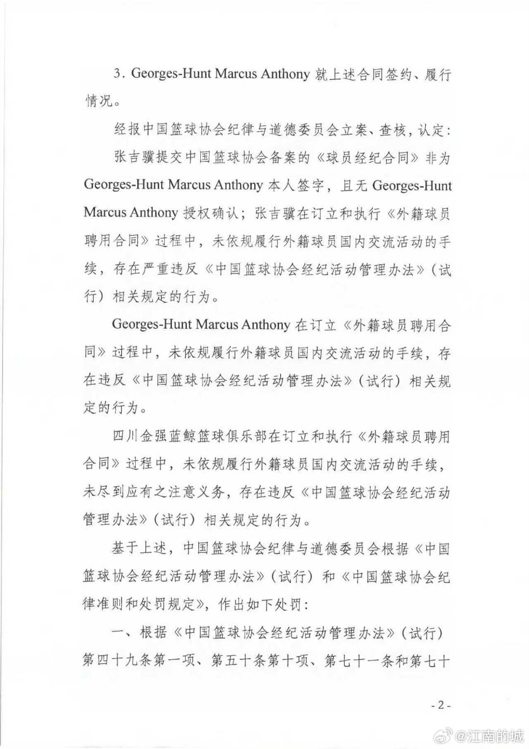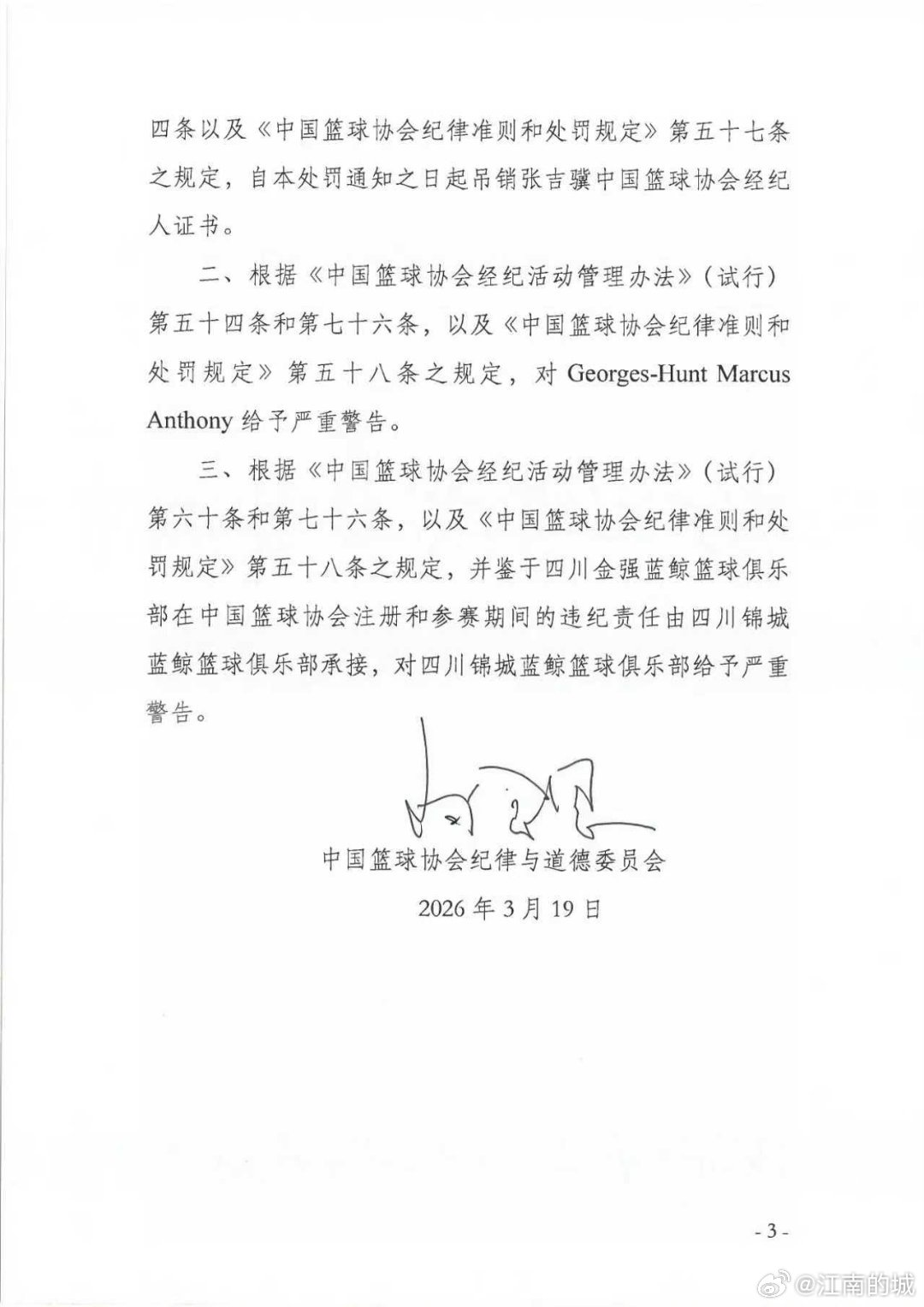 中国篮球协会纪律与道德委员会关于对张吉骥、Georges-Hunt Marcus Anthony 和四川锦城蓝鲸篮球俱乐部的处罚决定。