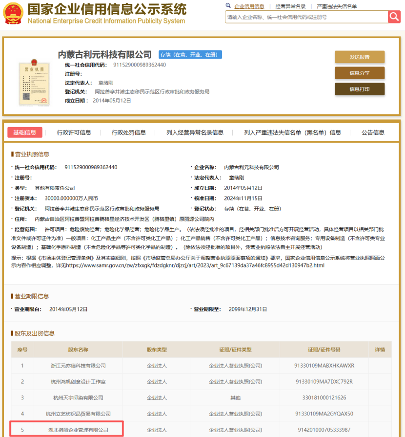 工商信息显示,利元科技主要从事化工产品生产、基础化学原料制造及化工产品销售业务,拥有危险化学品生产资质。公司由浙江、湖北等企业共同出资,于2014年收购原丽源(内蒙古)科技有限公司的存量资产,重新启动已批复的精细化工建设项目,并新建增部分产品而来。