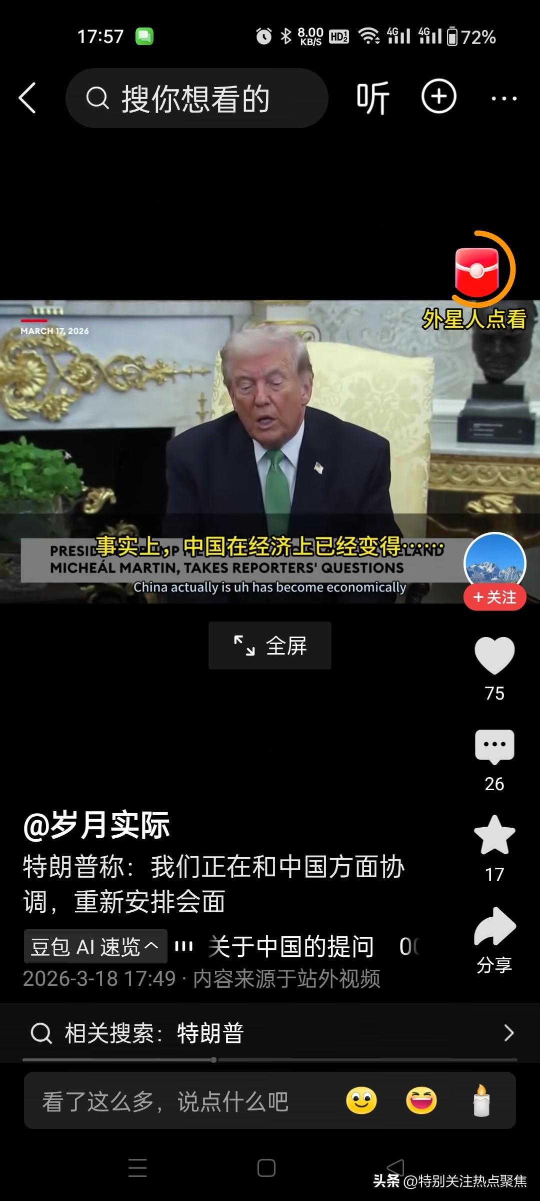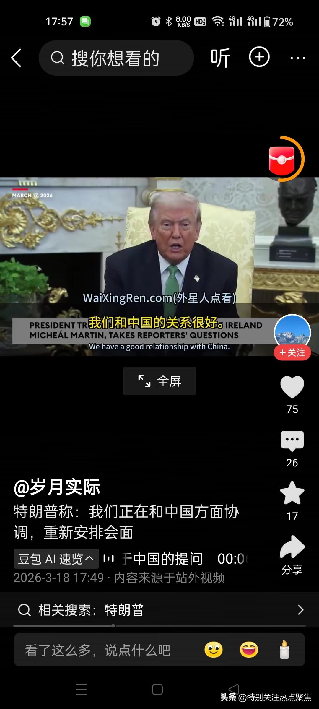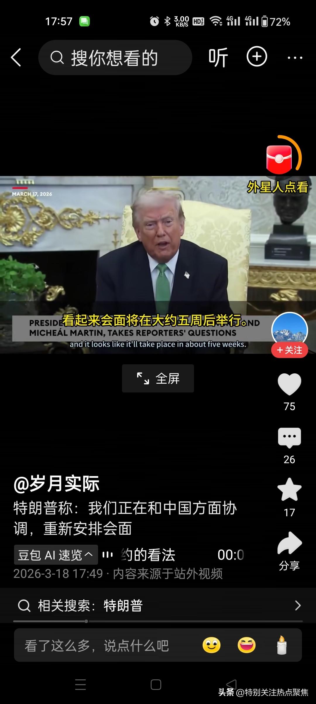 特朗普:我们和中国关系很好,我们正在和中国方面协调。特朗普:我很想去北京,但因为战争,我必须留在这里,我们正和中方沟通,我们请求把行程推迟一个月左右; 这并不是什么耍花招,我很期待和他们见面,我们的关系非常好,但我们正处于战争之中,所以我们计划往后推一推,但不会推迟太久