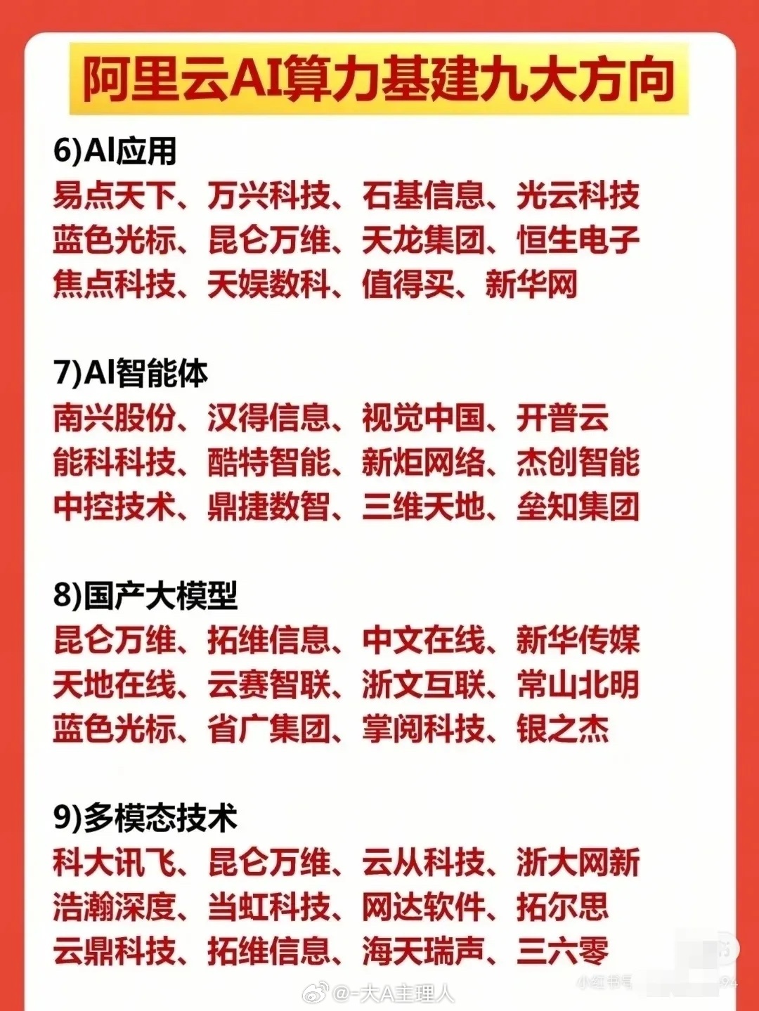 以下内容围绕阿里云AI算力基建九大方向(算力核心、AI硬件、液冷、数据中心、铜缆高速链接、AI应用、AI智能体、国产大模型、多模态技术)梳理了相关产业链公司,并从算力八大厂阵营(阿里系、华为系、英伟达系、百度系、字节系、腾讯系、小米系、智普系)角度,进一步整理了各阵营对应的核心合作/关联企业,清晰呈现AI算力领域的方向布局与厂商阵营生态。