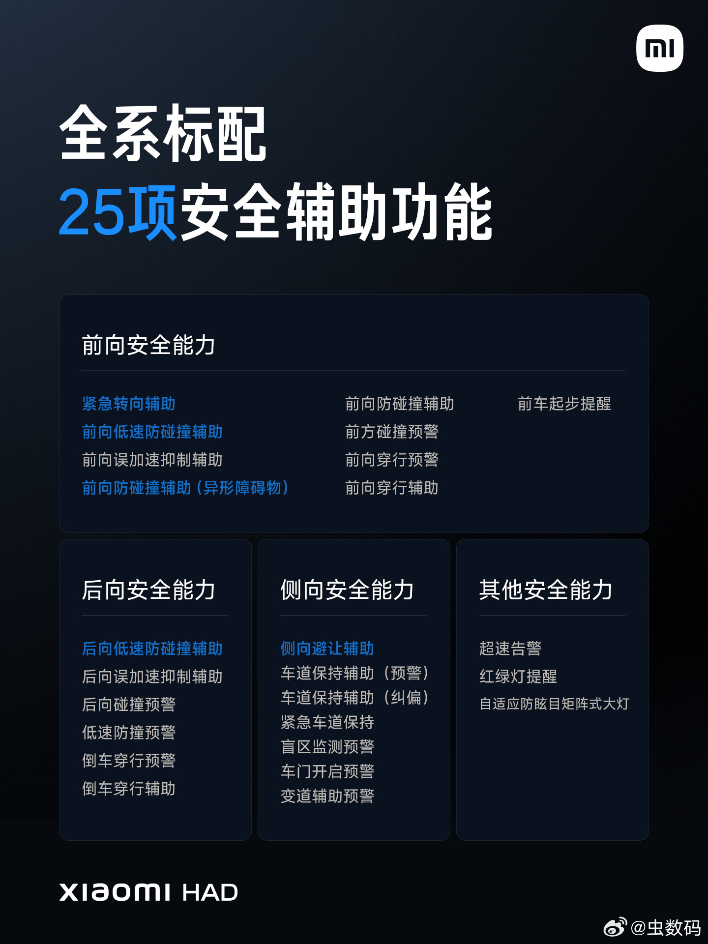 小米 HAD 辅助驾驶虽然进步很大,升级了 XLA 认知大模型,升级了商城地库车位级领航,三大能力提升 ,标配 25 项安全辅助功能。