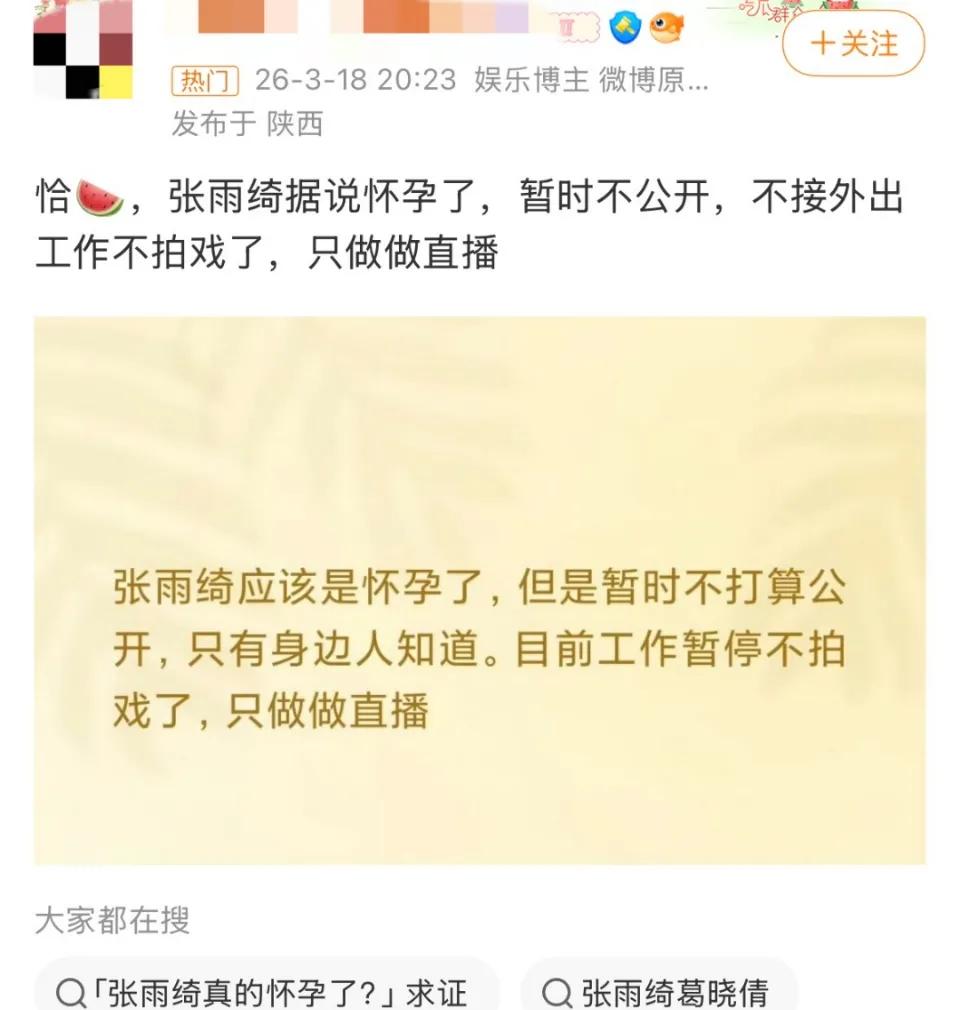 张雨绮被曝又怀孕了,葛晓倩发文嘲讽:团队琢磨了两个月,想用这种公关手段来反转舆论? 有娱乐博主爆料称张雨绮为养胎暂停影视工作,仅保留直播业务。截至目前,该消息仅来自匿名工作人员,张雨绮本人及工作室均未回应,也没有任何官方确认或实锤证据。 一方面,她近期直播时身形较为清瘦,与“明显孕相”的说法互相矛盾;另一方面,该传闻又恰逢代Y争议尚未平息的敏感时期,难免让人怀疑其动机。 张雨绮也是人设翻.车的典型了,很长一段时间里她在社交媒体受欢迎的程度,远大于其作品和演技。 然而却被葛晓倩多次爆料代Y和插足,讽刺的是,这两个污点,和其在脱口秀与综艺上展现的所谓女性力量、女性成长,完全背离,或者换个说法,她们能如此光鲜,恰恰是靠追捧她们的普通女性。她的直爽曾是内娱稀缺品,大女主、敢爱敢恨、金句频出,但这也是双刃剑:生育风波、感情纠葛,让曾经的“真性情”标签,在一次次风波中逐渐变了味。 无论是张雨绮的恋情,还是张雨绮的婚姻,都是开始的“轰轰烈烈”,却结束的“打打闹闹”。光彪悍不行,也要有脑子,这一波得罪了很多观众,能不能再度翻身就看本事了。