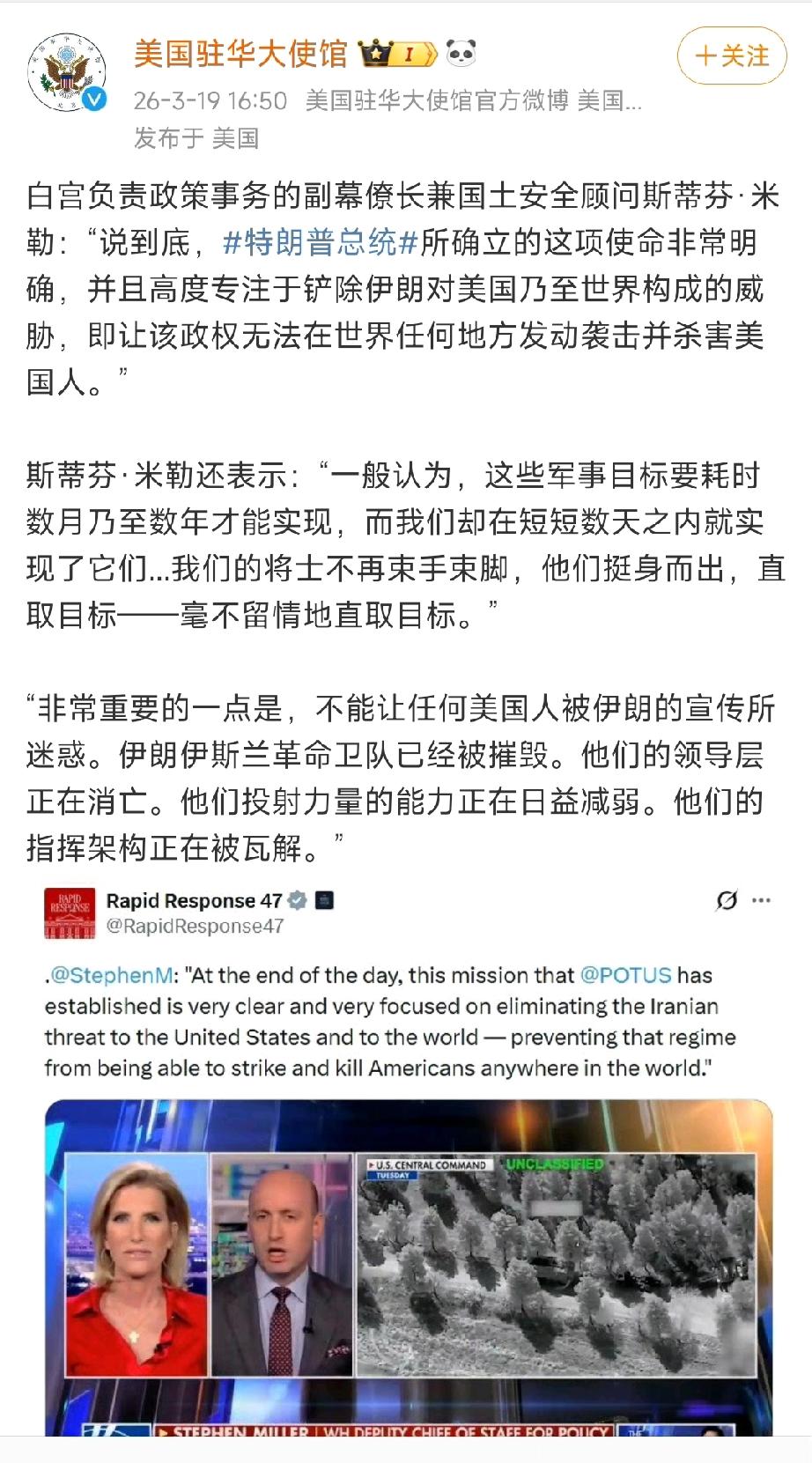 美国驻华大使馆发这个让谁看? 今天,美国驻华大使馆刊发了白宫副幕僚长米勒就美伊战争接受媒体采访内容,其中米勒说了这样四句话 “伊朗革命卫队已被摧毁,领导层正在消亡,投射能力正在减弱,指挥架构正被瓦解……” 米勒一句话就把伊朗说死了。