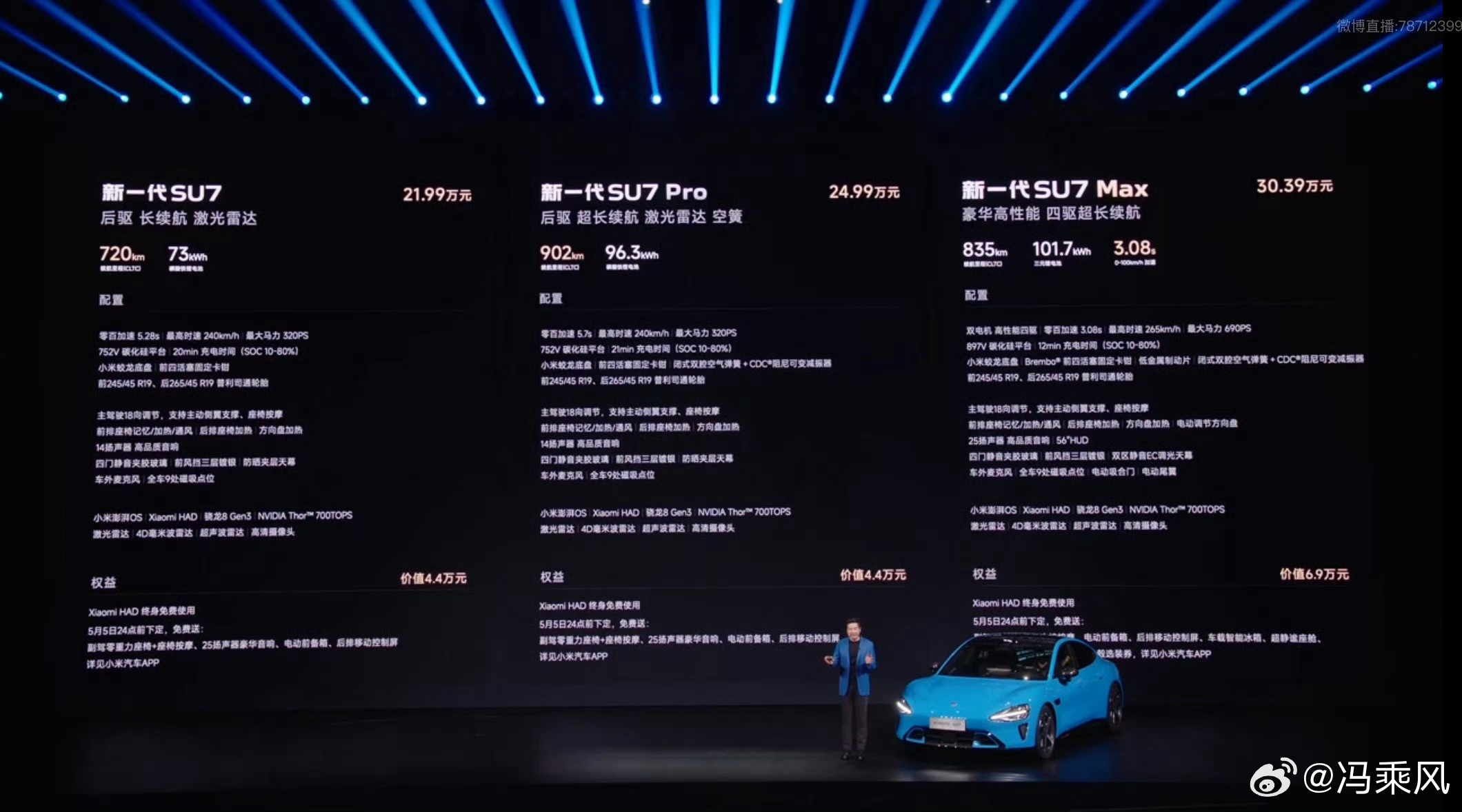 新一代SU7 标准版 21.99万。Pro版 24.99万,Max版 30.39万。全系标配激光雷达,入门比上一代顶。这一代SU7会不会如雷军所说依然会热销?小米发布会