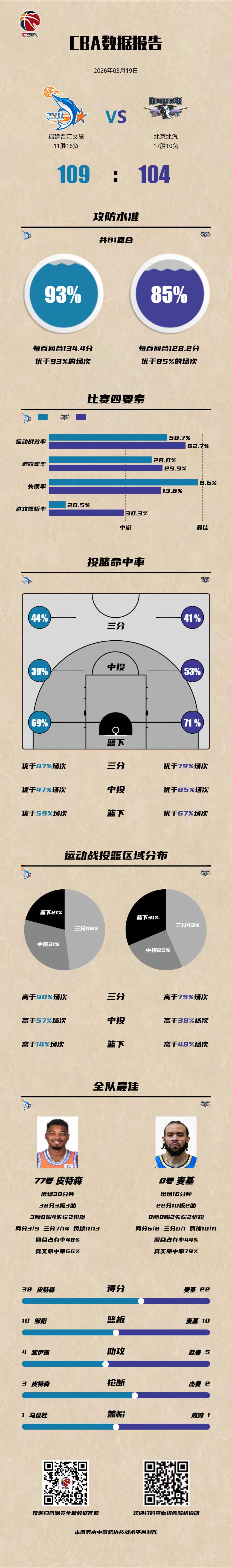 福建晋江文旅 109-104 北京北汽 福建男篮vs北京男篮 福建晋江文旅:皮特森38分3篮板3助攻3抢断,邹阳25分10篮板,马昆杜19分4篮板3助攻; 北京北汽:麦基22分10篮板,杰曼20分3助攻2抢断,周琦15分10篮板。以城之名