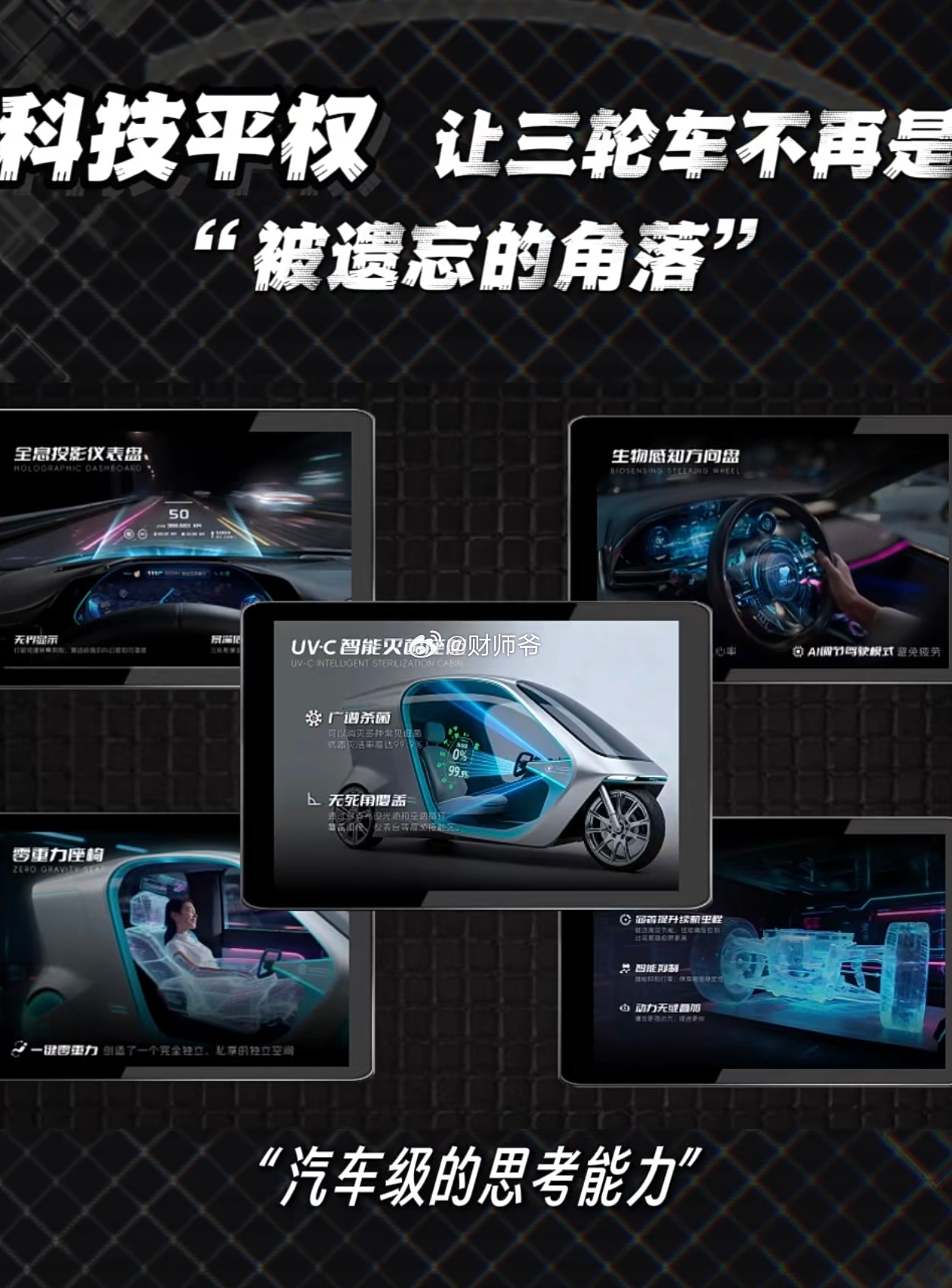 有一家山东的新创公司,把三轮车做了智能化升级,重新做了一遍。产品的思路很简单,就是把智能汽车该有的一切都塞进了三轮车里:比如激光雷达、辅助驾驶系统、氛围灯、云感座椅、一键躺平、助力爬坡、语音交互、智能导航、全息投影大屏……外形设计的也很有高级感,售价达到万元级别,春晚亮相后,订单如雪片般飞来。