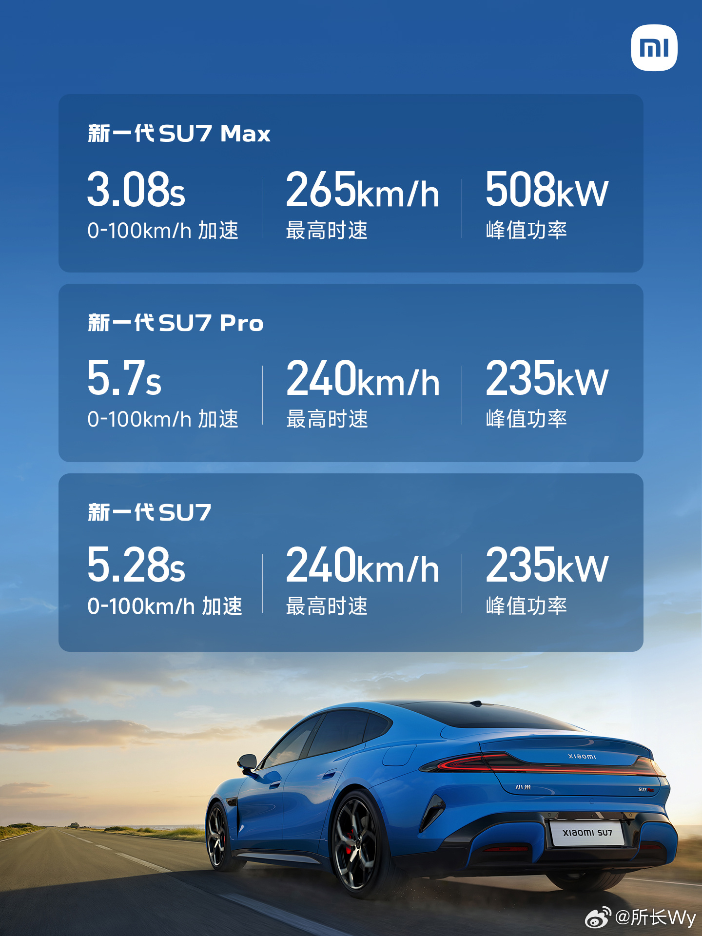 新一代SU7 更好开了动力大升级|全系搭载V6s Plus 超级电机,Max版零百加速3.08s,最高时速265km/h全系长续航|Pro版 CLTC续航902km,Max版CLTC续航835km,标准版CLTC续航720km 全系快充|全系碳化硅高压平台,Max版最大充电倍率5.2C,10%-80%最快充电时间12分钟