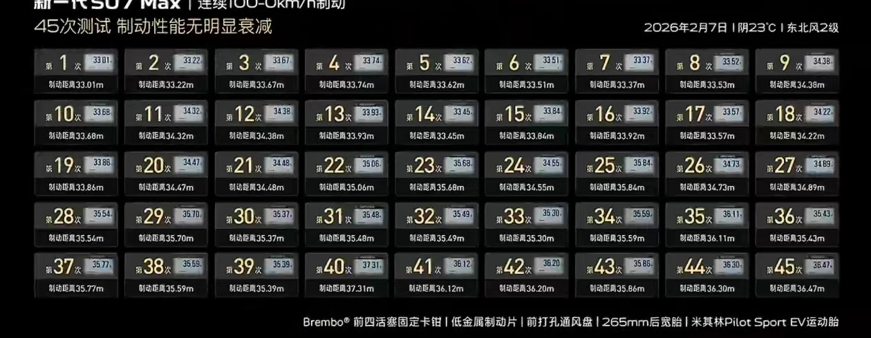 新SU7连续45脚零百制动不衰减连续45脚零百公里制动测试是什么概念?普通性能车跑到第8次可能就开始脚感发软,而新SU7直到第45次,刹车依然稳,100-0km/h干地制动距离还是死死钉在33.3米。这表现也太顶了!更难得的是热衰减控制得如此稳健。能实现这种持久表现,硬件层面其实给得很实在。Brembo四活塞固定卡钳、低金属刹车片,加上打孔盘和那条宽胎,整套组合明显是冲着持续稳定性去的。相比之下,有些性能车在类似测试中,到第15次制动距离可能就增加4米以上了。说到底,性能不该只是冲刺那一下的快感,能收得住、反复收得稳,才真正给人底气。纽北圈速背后,往往藏着对这些日常难以触及的极限工况的打磨。新SU7这套制动系统,从头到尾都在说一件事:真正的安全,是任何一脚都值得信任。