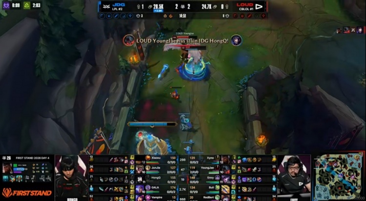 [14:51]xyno奎桑提给大打残HongQ阿狸,YoungJae剑魔绕后越塔完成强杀!但是JDG又可以抓timing拆掉LOUD的中一塔,顺势拿下峡谷先锋!4K经济差了啊!