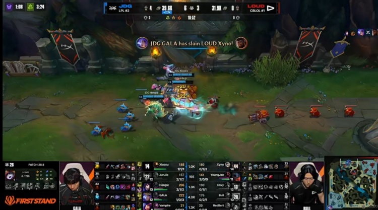 [18:40]LOUD交出双TP绕后包上但是第一时间没猜到JDG下路组的位置!Junjia赵信开大配合队友先秒中辅,残局JDG上中黏住了xyno奎桑提,最终GALA芸阿娜拿下击杀!这波JDG打出1换4,拆掉对手上二塔!9K经济差了!