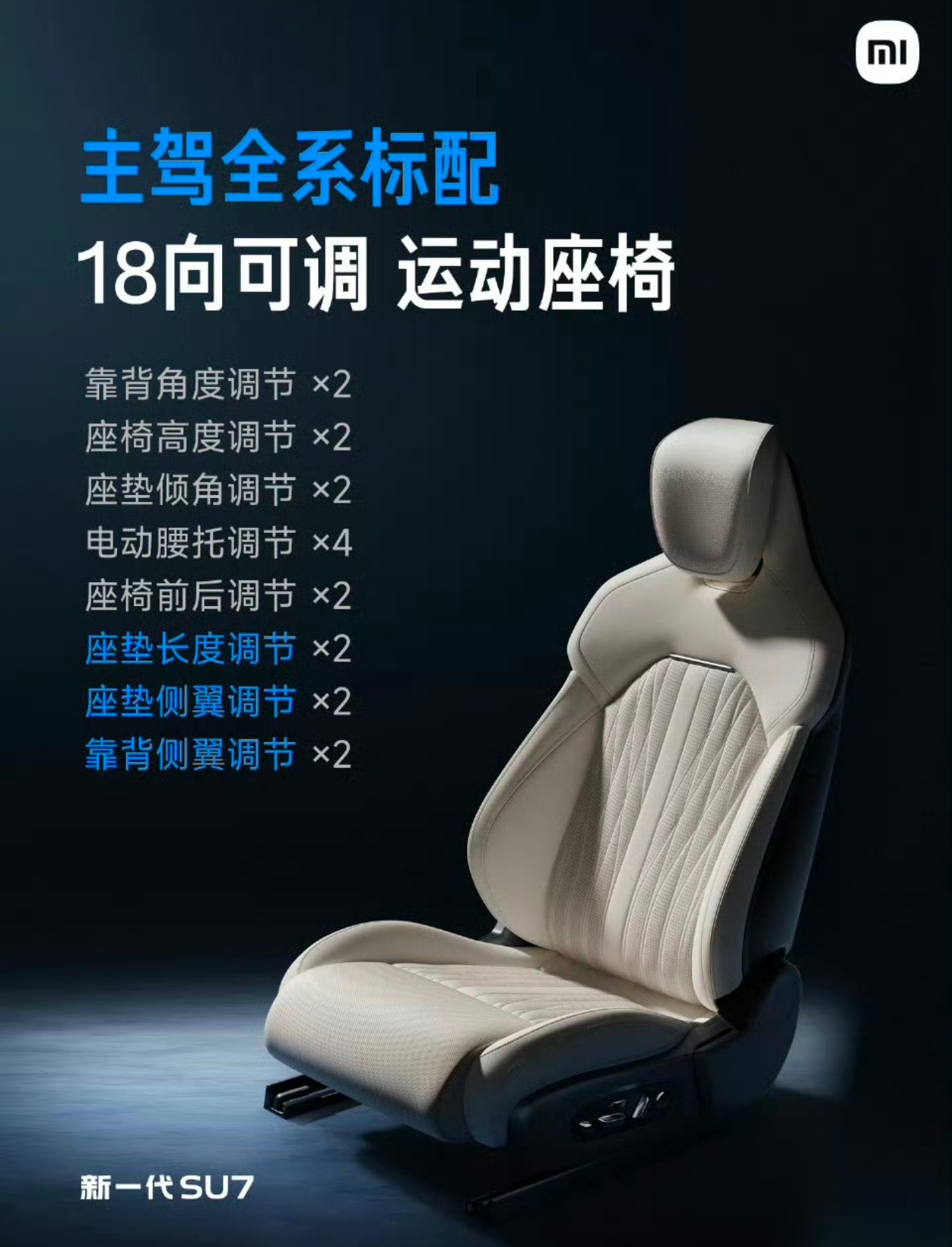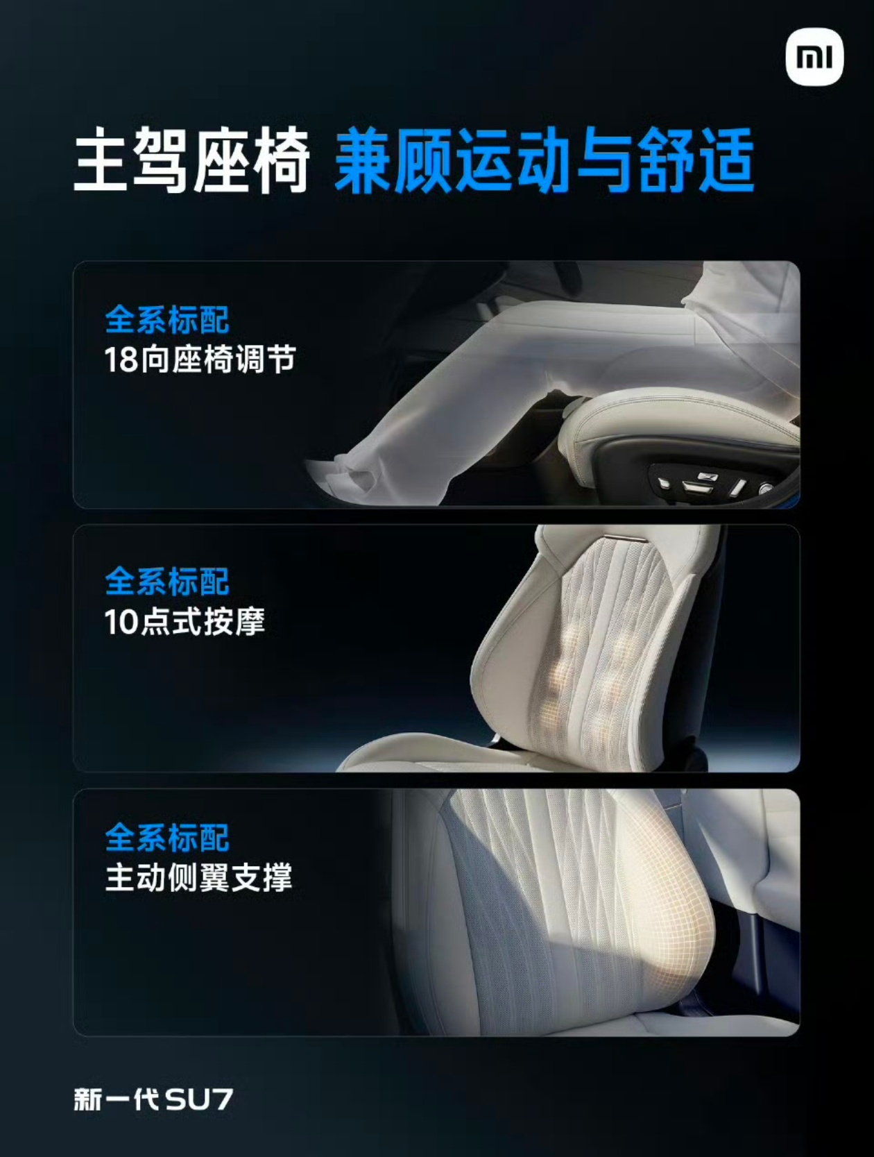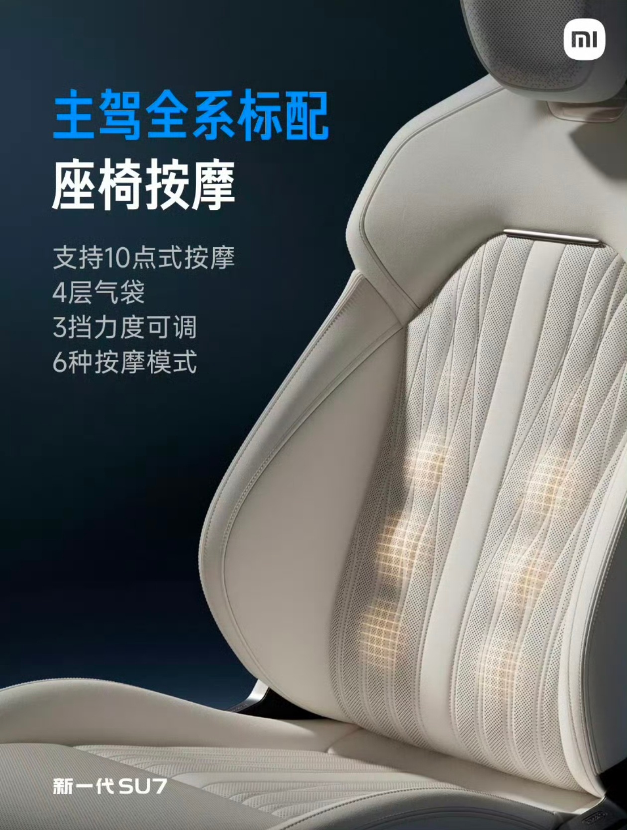 新SU7标配18向可调座椅看座椅配置,新SU7这回真是下了本。全系标配18向调节,放在过去,这种规格通常只在百万豪车里才能见到。对比一下,宝马5系高配是14向,奔驰E级顶配16向,就连保时捷Taycan的18向座椅还得加价2.8万选装——小米直接标配,这波诚意确实够足。以往座椅调节总有点“挤牙膏”的意思,传统8向只能算勉强够用。而新SU7的18向,能针对腰、背、腿甚至肩部做精细调整,实际坐上去,无论高矮胖瘦,都很容易找到合适的支撑点。这还真不是摆设,对视野和坐姿的提升挺明显的。更让我意外的是,它甚至塞进了10点4层按摩,副驾还有零重力模式。主驾侧保留了一些运动感,但舒适度没打折;副驾和后排在舒适上直接跃升了一个级别。这么一来,新SU7在驾驶乐趣和豪华体验之间,拿捏得倒是蛮自然的。