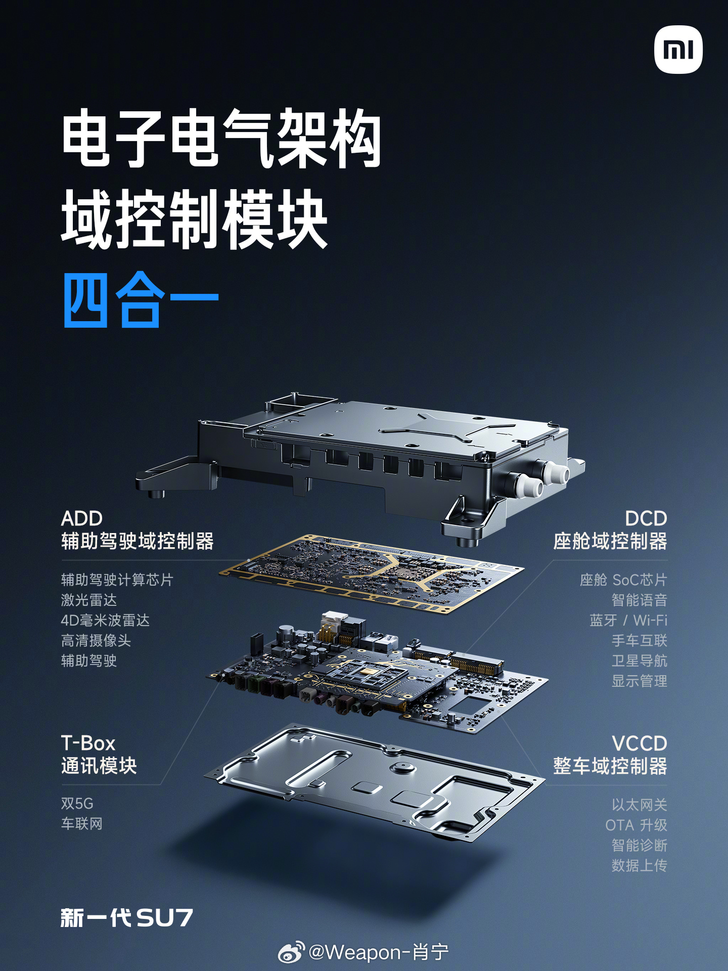 新一代SU7 电子电气架构全面升级。域控制模块四合一,面向智能时代,更高集成,更