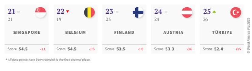 2026年全球软实力Top20,中国得分上涨 2026年1月,英国品牌金融公司发布的《2026年全球软实力指数》报告显示,中国是前10名中唯一排名上升的国家,多项指标排名全球第一。 Top20名单如下图: 得分满分为100分,Top20得分排名如下: 1、美国74.9分,同比下降4.6分——是Top20中得分降幅第一。 2、中国73.5分,同比增长0.7分——前10中唯一得分上涨且前20中得分上涨最多! 3、日本70.6分,同比下跌0.9分。 4、英国69.2分,同比下跌3.2分——Top20中降幅第二。 5、德国67.7分,同比下跌2.4分——Top20中降幅第四。 6、法国65.8分,同比下跌2.7分——Top20中降幅第三。 7、瑞士63.2分,同比下跌1.7分——Top20中降幅第六。 8、加拿大63.2分,同比下跌2分——Top20中降幅第五。 9、意大利61.6分,同比下跌0.8分。 10、阿联酋59.4分,同比下跌1分。 11、韩国59.2分,同比下跌1分。 12、西班牙58.9分,同比下跌0.8分。 13、瑞典58.8分,同比下跌1.5分——Top20中降幅第七。 14、俄罗斯58.7分,同比上升0.6分。 15、荷兰57.8分,同比下跌0.9分。 16、澳大利亚57.5分,同比下跌2.1分——Top20中降幅第四。 17、沙特阿拉伯55.9分,同比上升0.3分。 18、丹麦55.6分,同比下跌0.9分。 19、挪威55.4分,同比下跌1.4分——Top20中降幅第八。 20、卡塔尔54.9分,同比上升0.4分。 Top20中,欧美国家软实力指数得分普遍下跌,其中美国得分暴跌,多项指标被中国反超。 Top21-25如下: 21、新加坡得分54.5分,同比下跌1.1分。 22、比利时得分54.5分,同比下跌1.5分。 23、芬兰得分53.5分,同比下跌1分。 24、奥地利得分53.3分,同比下跌0.6分。 25、土耳其得分52.4分,同比下跌0.5分。 由上可见,以往被誉为“幸福国家”北欧五国中的芬兰、瑞典、挪威、丹麦4国得分均下跌。传统的发达国家美国、英国、德国、法国、瑞士、加拿大、澳大利亚等国得分都大幅下跌,软实力也随之下降。相反,发展中国家如中国、俄罗斯、沙特、卡塔尔等国软实力有所上升。 为什么呢? 注:图源网络