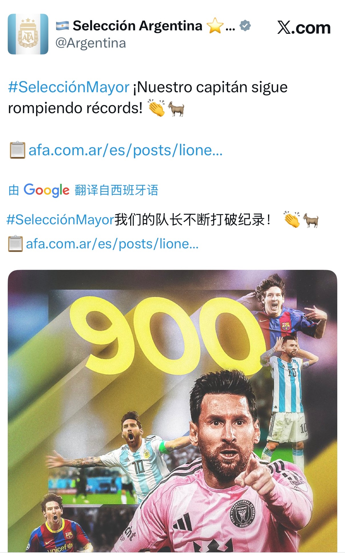 阿根廷国家队祝贺梅西达成900球里程碑。🐐🇦🇷