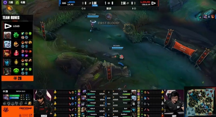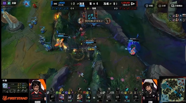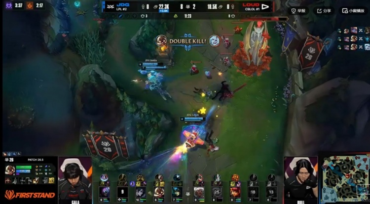 [15:20]LOUD上路四抓一但是被xiaoxu贾克斯晕三个+交闪拉扯成功!JDG支援赶到,没人管的GALA库奇输出拉满,和xiaoxu贾克斯各自砍下双杀!JDG打出1换4,回头拿下先锋!两队经济差已经接近一万!