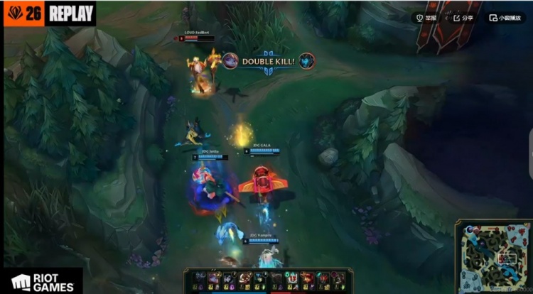 [11:22]下路3V3,Vampire娜美大招+水泡配合Junjia波比击飞三个啊!LOUD下野辅毫无还手之力,被JDG逐个击破!JDG轻松打出一波0换3,GALA库奇双杀!这波打完之后LOUD又是上野包上,xiaoxu贾克斯依靠电扇+防御塔伤害换掉打野佛耶戈,但是自己还想追击被xyno安蓓萨转好技能1V2强行换掉!