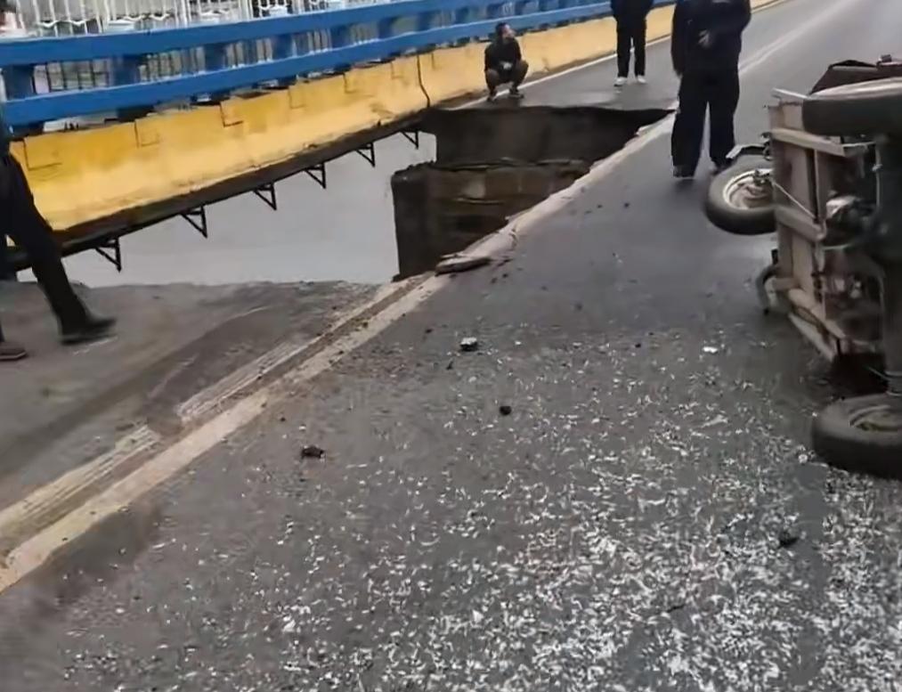 费县大王庄桥被一辆大货车压断了一节,令人唏嘘的是,当时桥下还有两个捞鱼的人,真命大! 他俩距离死神仅一步之遥。 现场也很能说明问题,大货车的后轮都掉了,旁边还躺着一辆三轮车! 不知道这辆货车拉了多重的货物,看车型轻不了。 这下损失大发了。