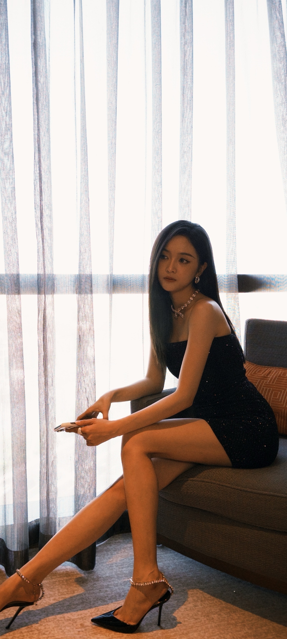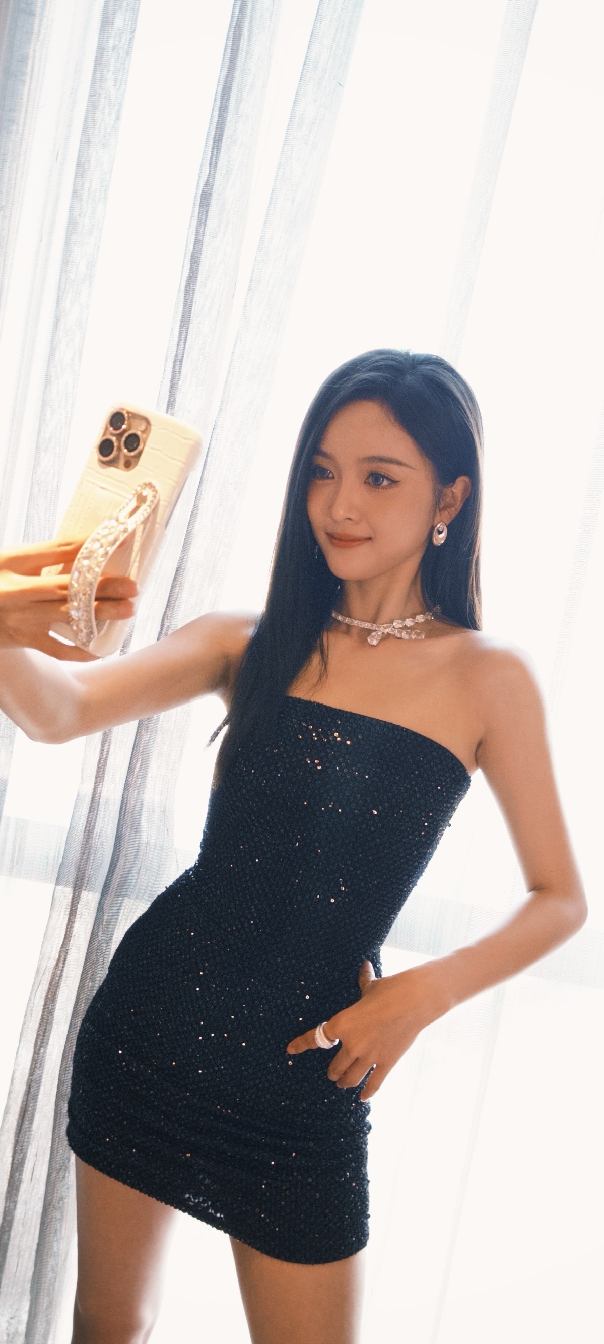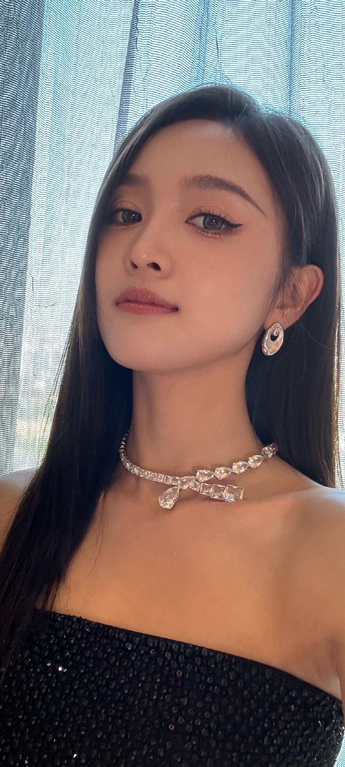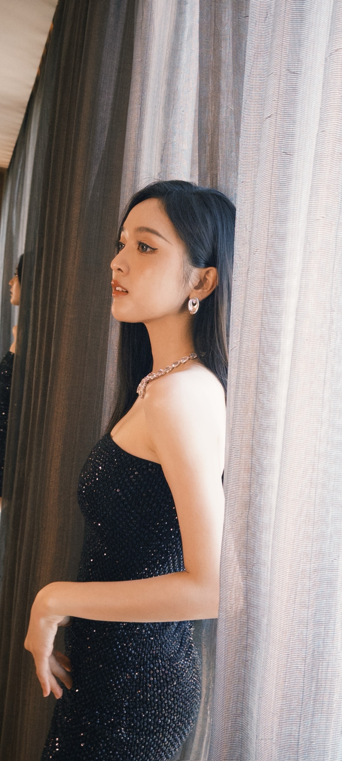 吴宣仪,浓颜直发抹胸黑裙,精致柔美。吴宣仪