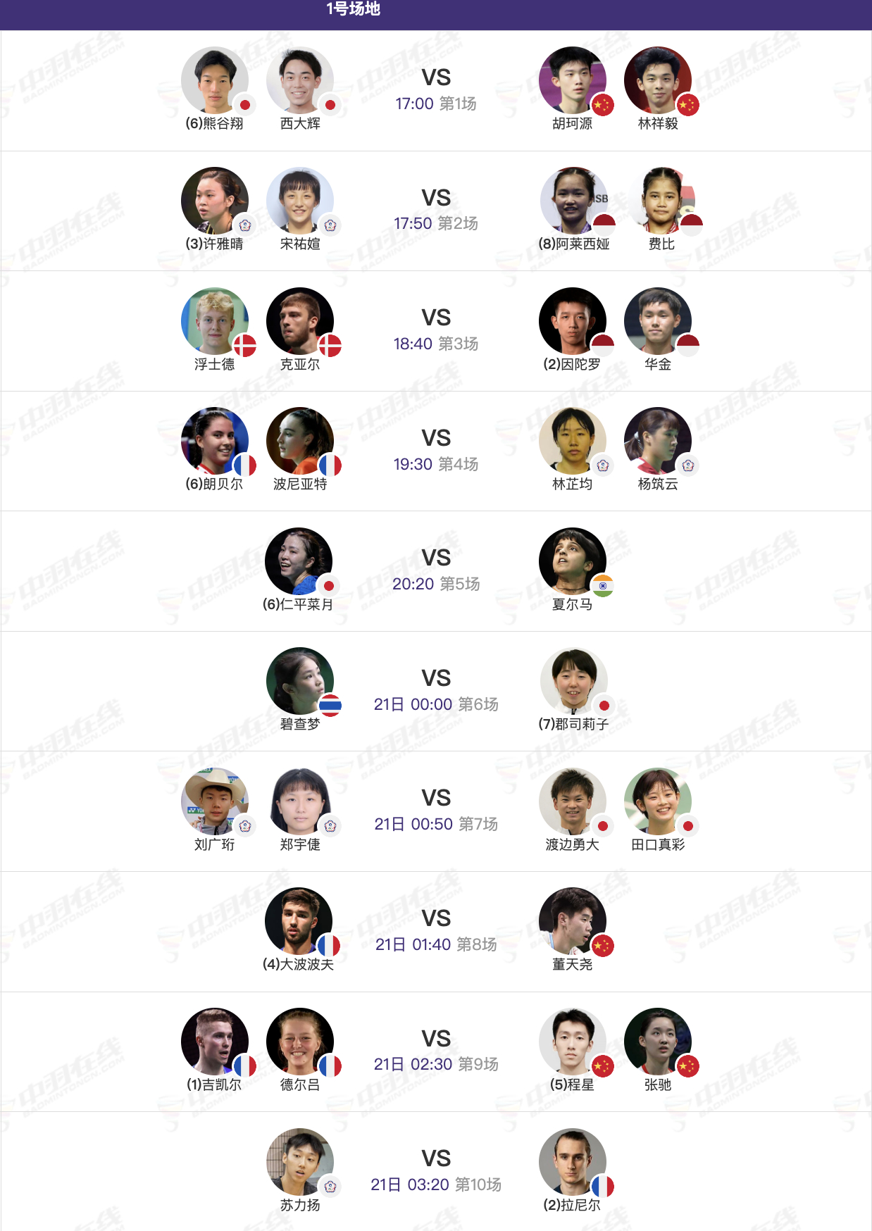 【1号场地】1、胡珂源/林祥毅🇨🇳 vs 🇯🇵熊谷翔/西大辉8、董天尧🇨🇳 vs 🇫🇷大波波夫9、程星/张驰🇨🇳 vs 🇫🇷吉凯尔/德尔吕(1-3)